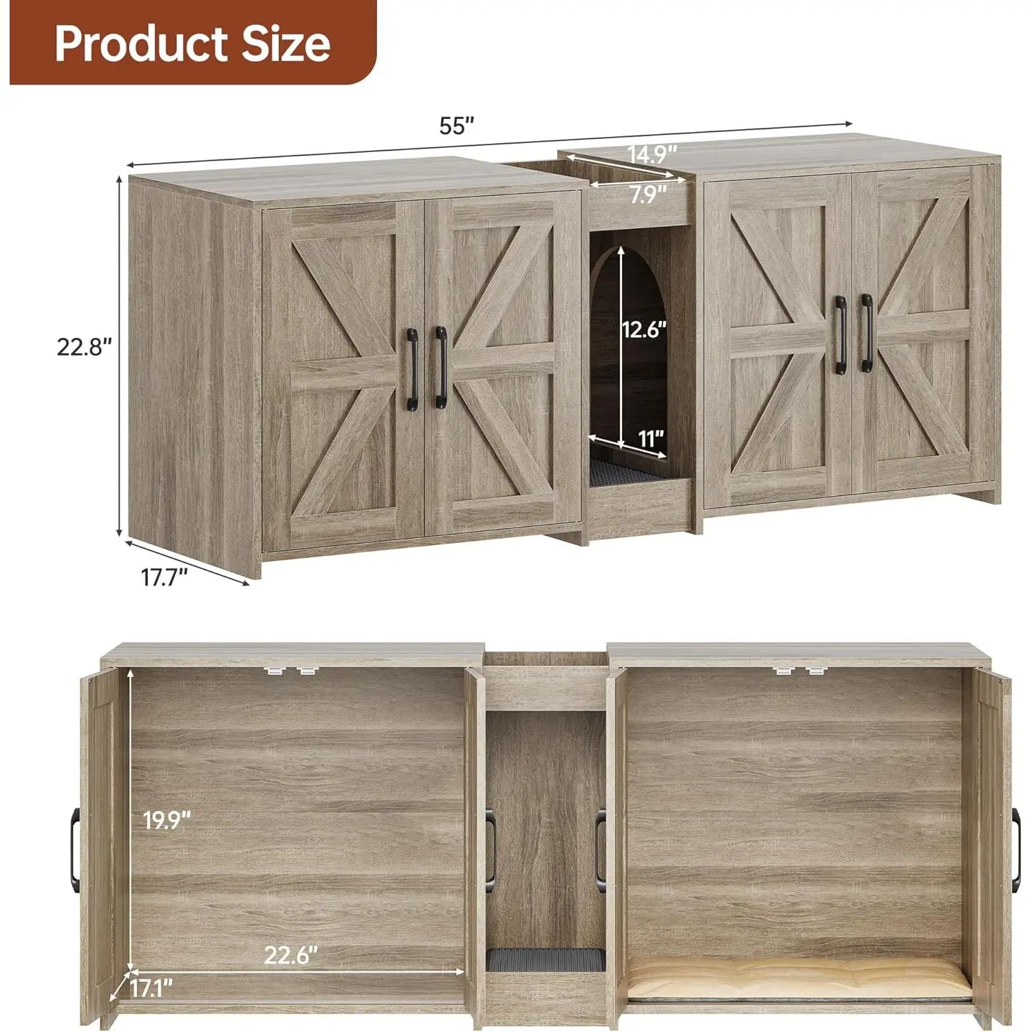 ·Ultra-Large Litter Box Accommodation: External Dimensions: 31*17*28.5 inches. Internal Dimensions:29.5*16.3*16.5 inches 。This cat litter enclosure features an exceptionally spacious built-in litter box area, designed to accommodate even the largest litter boxes, ensuring optimal comfort for your cat. An entrance hole on the right that facilitates free access for cats can promote proper ventilation and lighting in the interior space.
