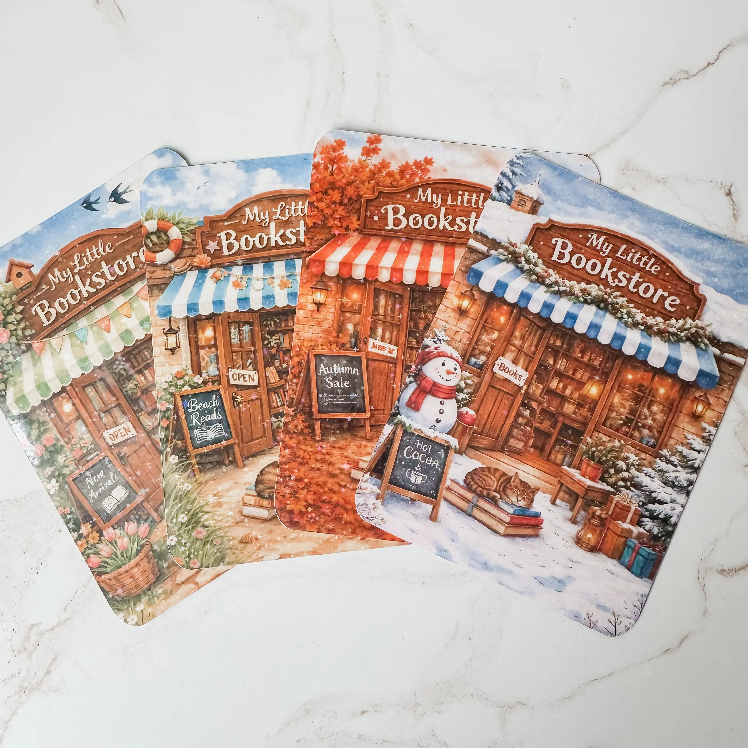 Four inserts, one special price! With this insert bundle you get a 'Little Bookstore' insert for each season: Spring, Summer, Fall and Winter. Keep your e-reader in style year round!