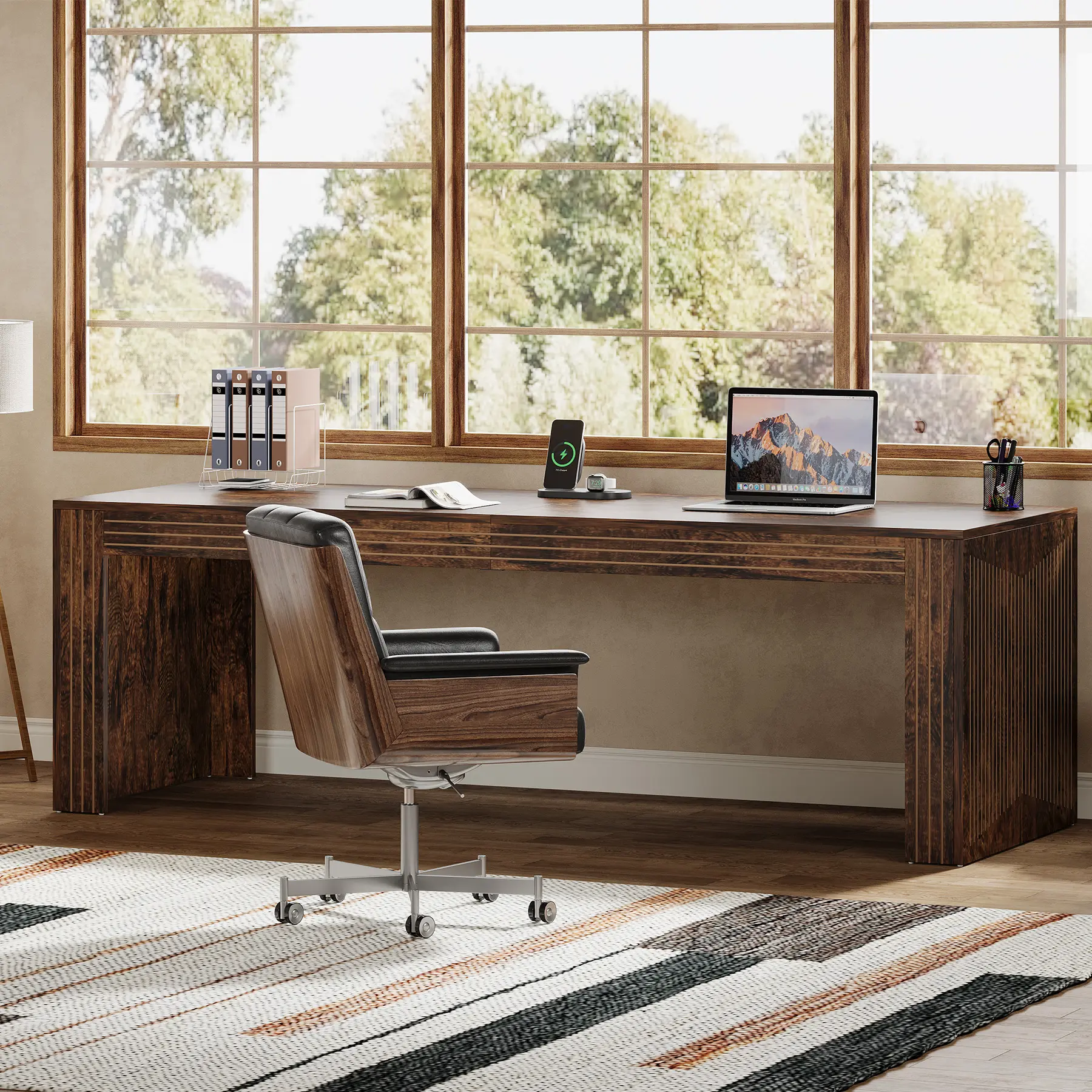 ·SIMPLICITY AND AESTHETICS: Our 79-inch long desk, characterized by a minimalist design that blends brown wood grain, exudes a trendy and contemporary ambience, seamlessly infusing your workspace or office with enduring style