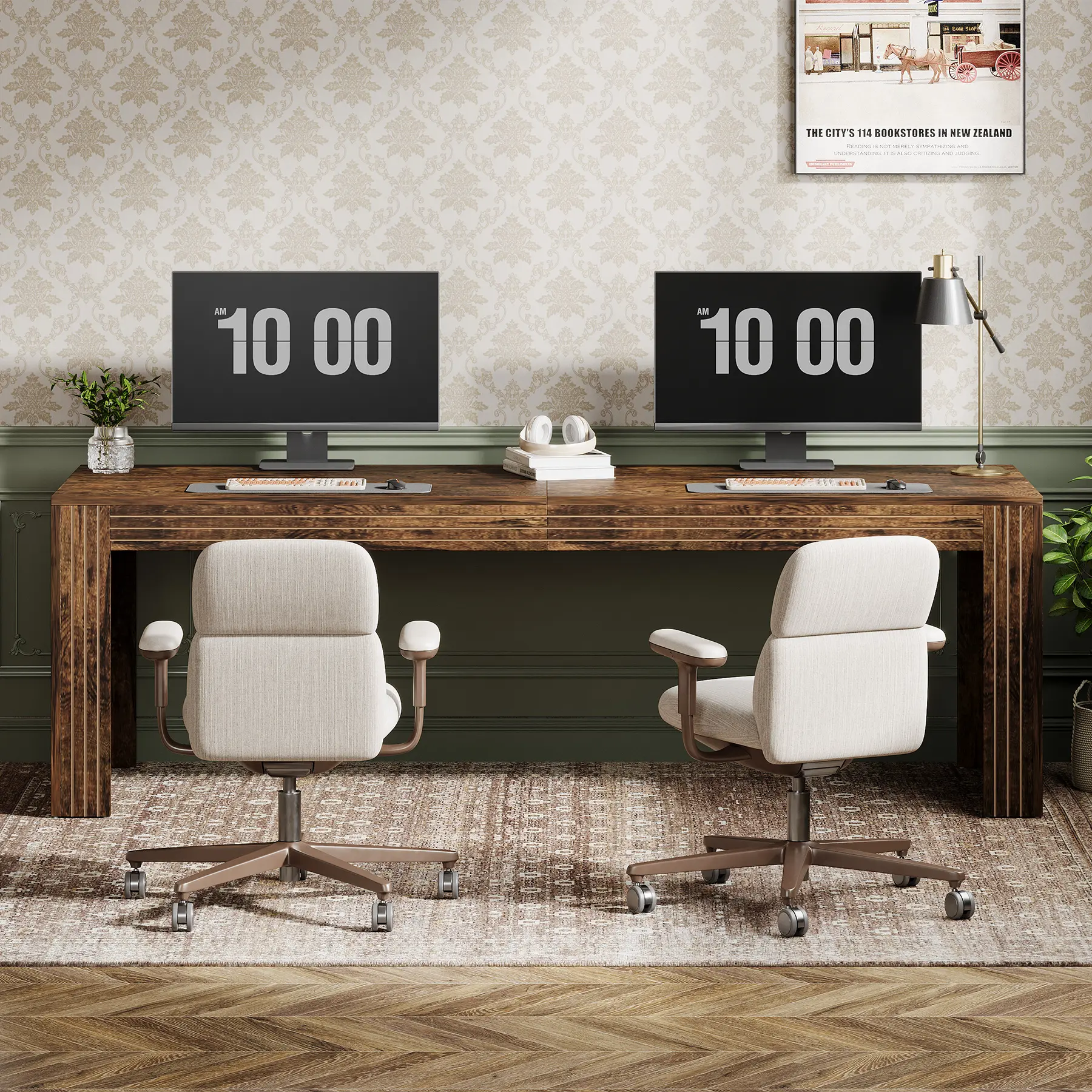 ·DOUBLE DESK DESIGN: The extra-long desk easily fits two monitors on one side, while still offering ample space for a computer, a printer, and assorted items on the other side. Also, it enables you to share your workspace with your partner or family members, without sacrificing personal space