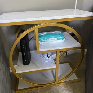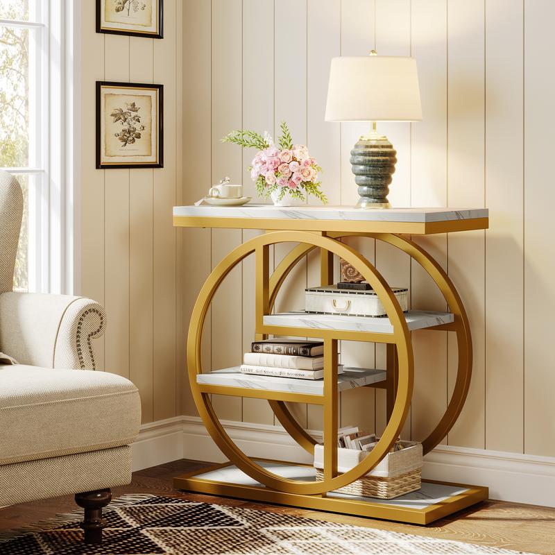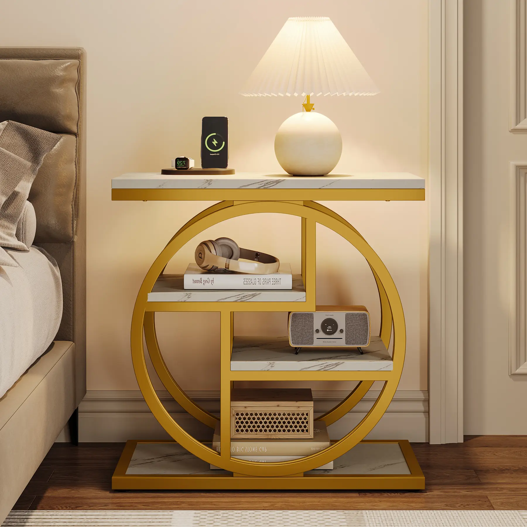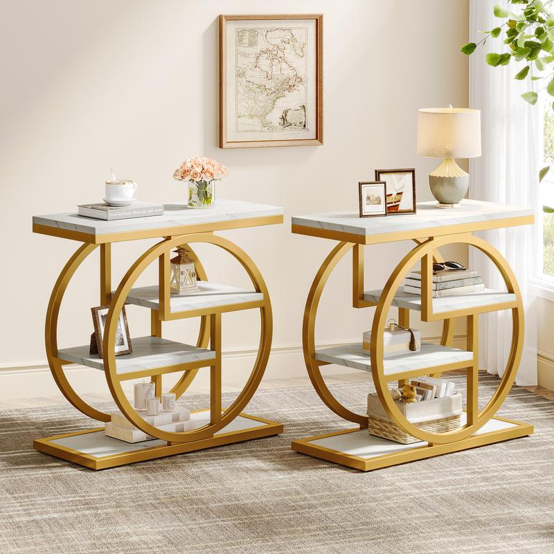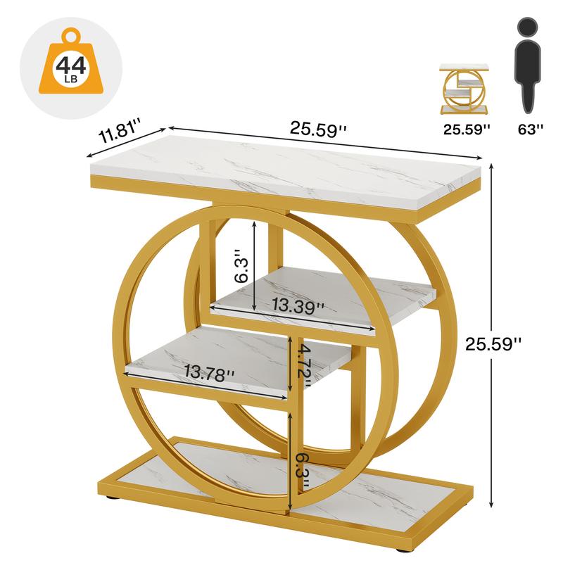 ·【Chic Modern Elegance】: Seamlessly blending a faux marble tabletop with a matte gold metal frame, this narrow end table beautifully complements any decor style. Its stylish and unique double round frame design not only adds visual depth to the piece but also makes it an eye-catching focal point in any room, sure to impress your guests.