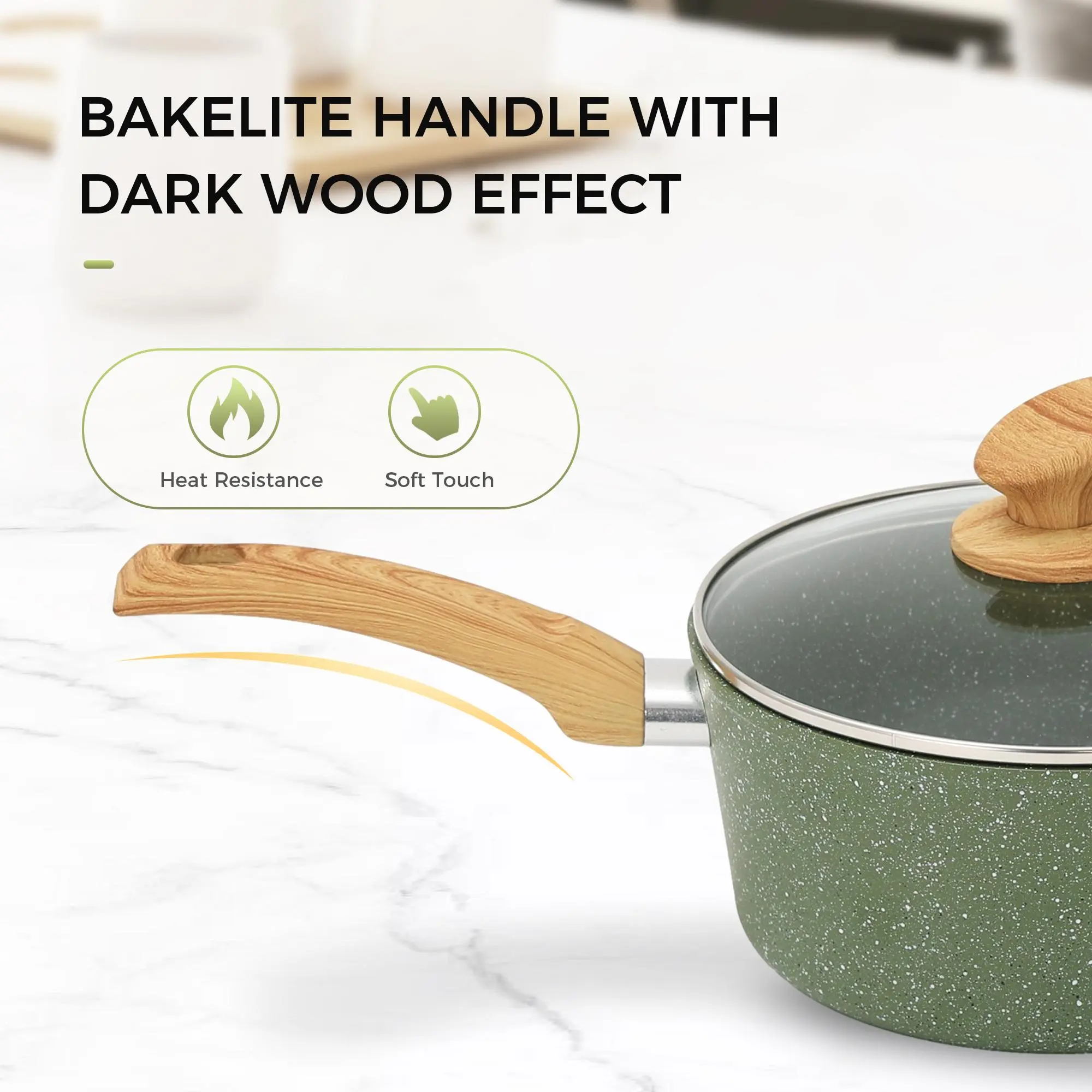 When it comes to the interior, this cookware uses an aluminum core. The result is that the pan heats up quickly, and more importantly, distributes heat evenly. The cookware set works on all major types of cooktops. Larger high magnetic conductive stainless steel base ensure induction compatible, especially glass stove