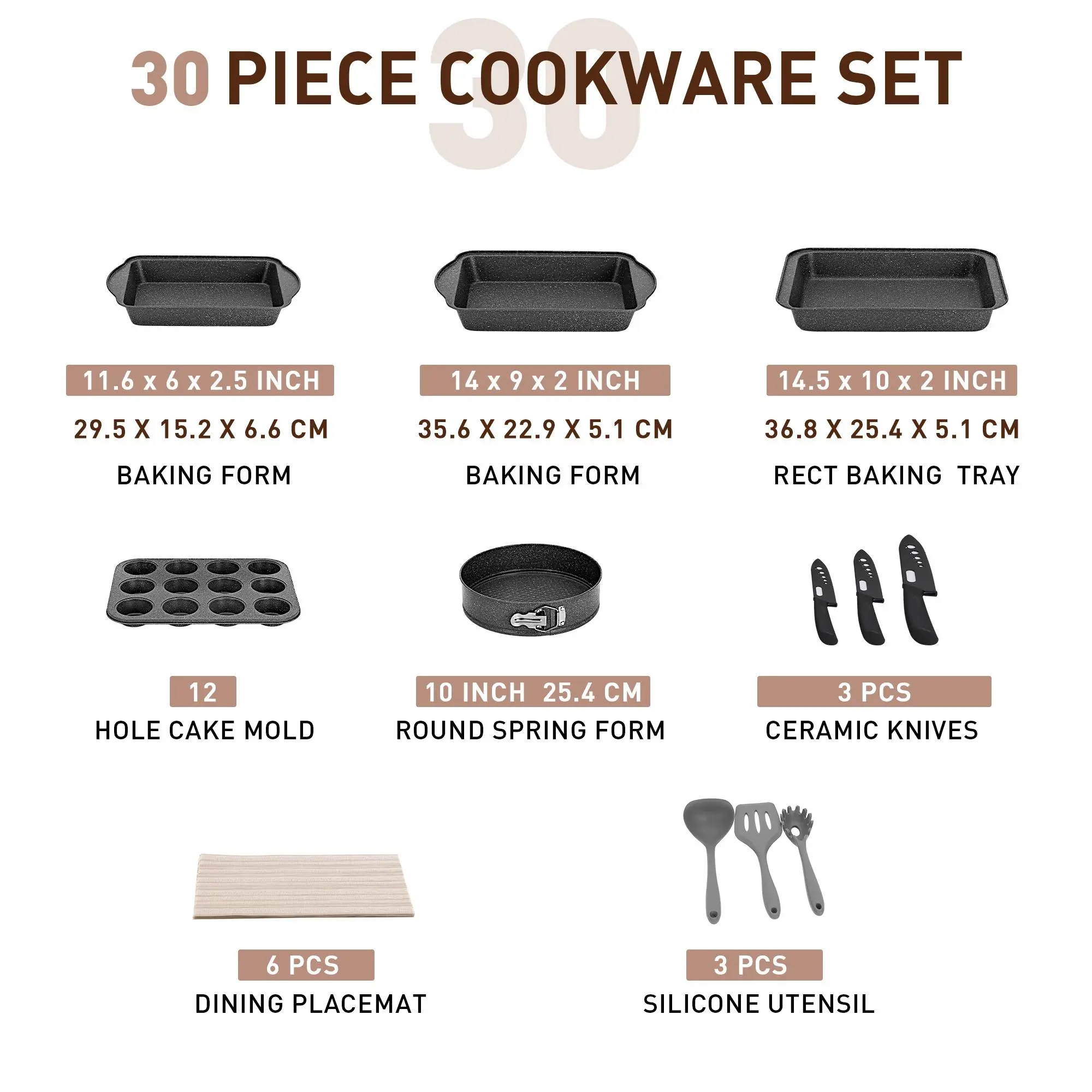 Include 5.5-inch fry pan / 8-inch fry pan / 11-inch fry pan / 9.5-inch deep fry pan with lid / 9.5-inch square steak fry pan / 1.5qt saucepan with lid / 3qt casserole with lid / 5qt casserole with lid / 5qt steamer / Baking form:14"x9.2"x2.2" / Baking form:11.6"x6"x2.5" / Rect baking tray 14.6"x9.8"x2.2" / Round spring form 10"x2.5" / 12 cup muffin pan:16"x10"x1.3" / 3 pcs silicone utensils / 3pcs ceramic knives / 6 pcs dining placemat