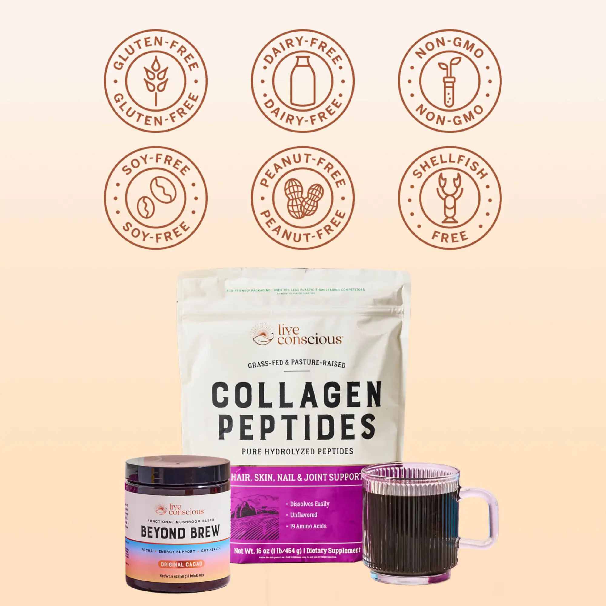The Morning Ritual offers total body support with our best-sellers Collagen Peptides and Beyond Brew. Collagen Peptides function as a beauty supplement, working to enhance skin elasticity and support joint health. Beyond Brew kickstarts your day with sustained energy, mental clarity, and digestive support from a 6-in-1 mushroom blend so you look (and feel) your best.
