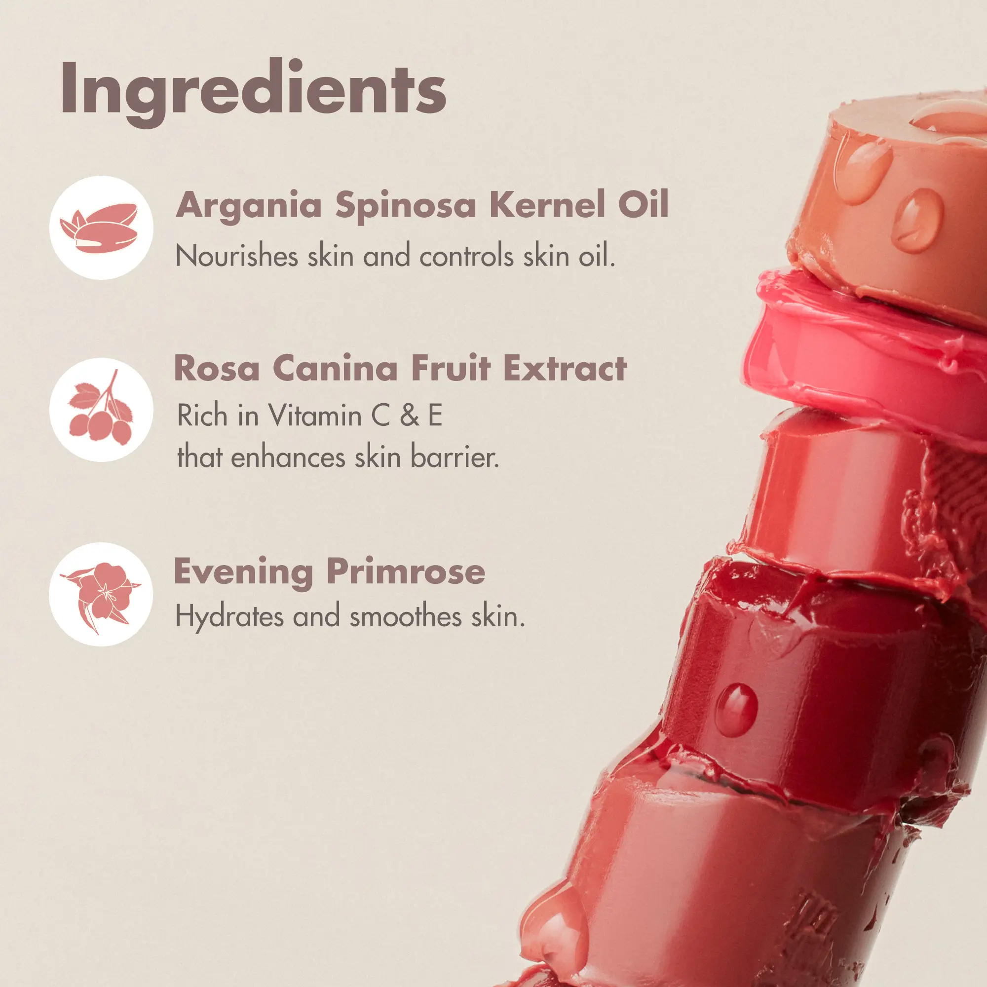 | Ingredients | Diisostearyl Malate,Bis-Behenyl/Isostearyl/Phytosteryl Dimer Dilinoleyl Dimer Dilinoleate,Polyglyceryl-2 Triisostearate,Bis-Diglyceryl Polyacyladipate-2,Paraffin,Tridecyl Trimellitate,Pentaerythrityl Tetraisostearate,Microcrystalline Wax,Sorbitan Isostearate,Synthetic Wax,1,2-Hexanediol,Disteardimonium Hectorite,Ethylene/Propylene Copolymer,Propylene Carbonate,Fragrance,Simmondsia Chinensis (Jojoba) Seed Oil,Prunus Amygdalus Dulcis (Sweet Almond) Oil,Prunus Armeniaca (Apricot) Kernel Oil,Oenothera Biennis (Evening Primrose) Oil,Olea Europaea (Olive) Fruit Oil,Argania Spinosa Kernel Oil,Butyrospermum Parkii (Shea) Butter,Camellia Japonica Seed Oil,Caprylic/Capric Triglyceride,Rosa Canina Fruit Extract,Mangifera Indica (Mango) Fruit Extract,Red 28 Lake (CI 45410),Yellow 6 lake (CI 15985),Red 7 Lake (CI 15850),Iron Oxides (CI 77499),Titanium Dioxide (CI 77891),Limonene,Linalool Hydrogenated Polyisobutene,Octyldodecanol,Ethylhexyl Hydroxystearate,Menthyl Lactate,Silica Dimethyl Silylate,Dextrin Palmitate,Dibutyl Lauroyl Glutamide,Dibutyl Ethylhexanoyl Glutamide,Calcium Aluminum Borosilicate,Anemarrhena Asphodeloides Root Extract,Tin Oxide,Tocopherol |