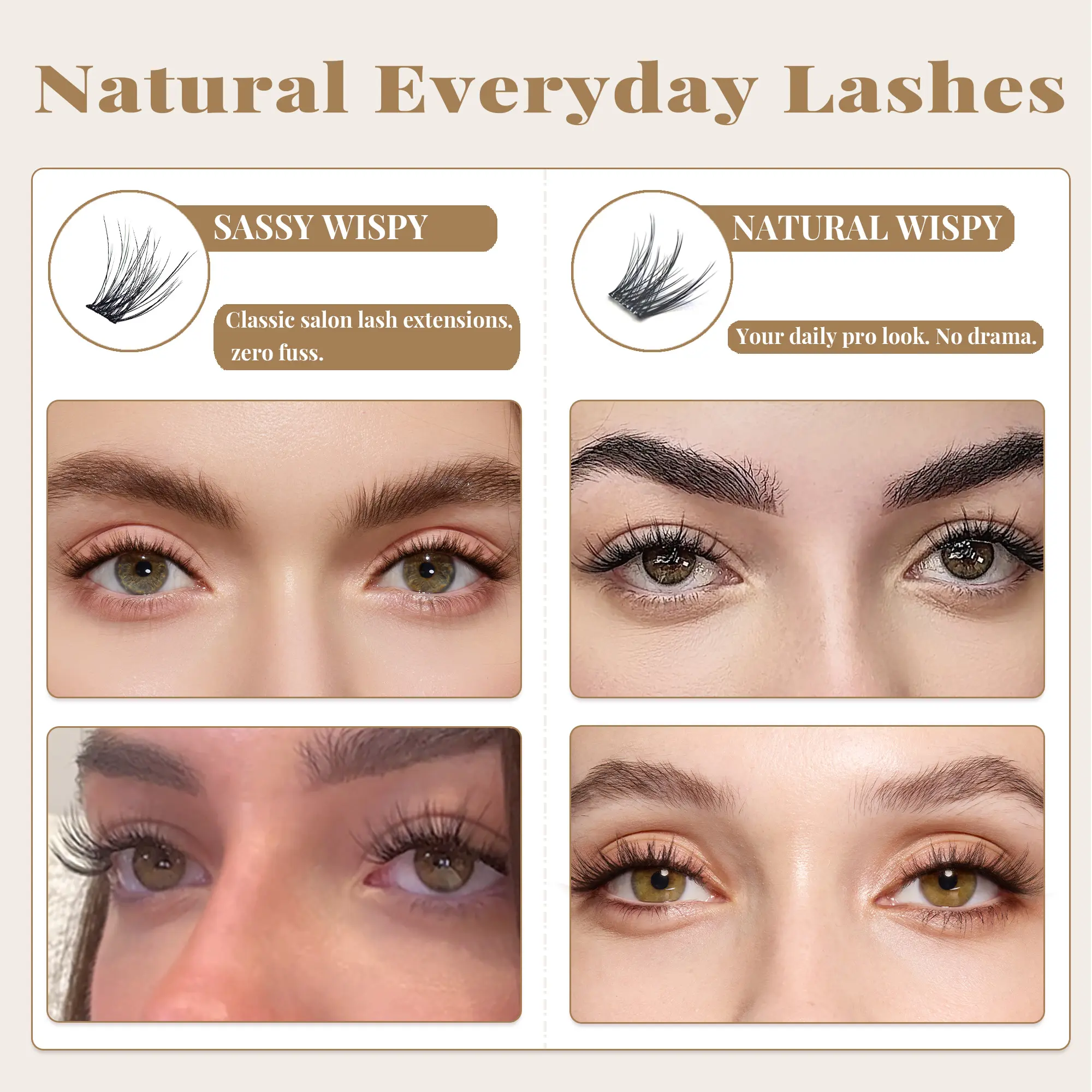 ·Sassy Wispy: 120 lash clusters in three lengths: 24 x Short (10mm); 48 x Medium (12mm); 48 x Long (14mm)