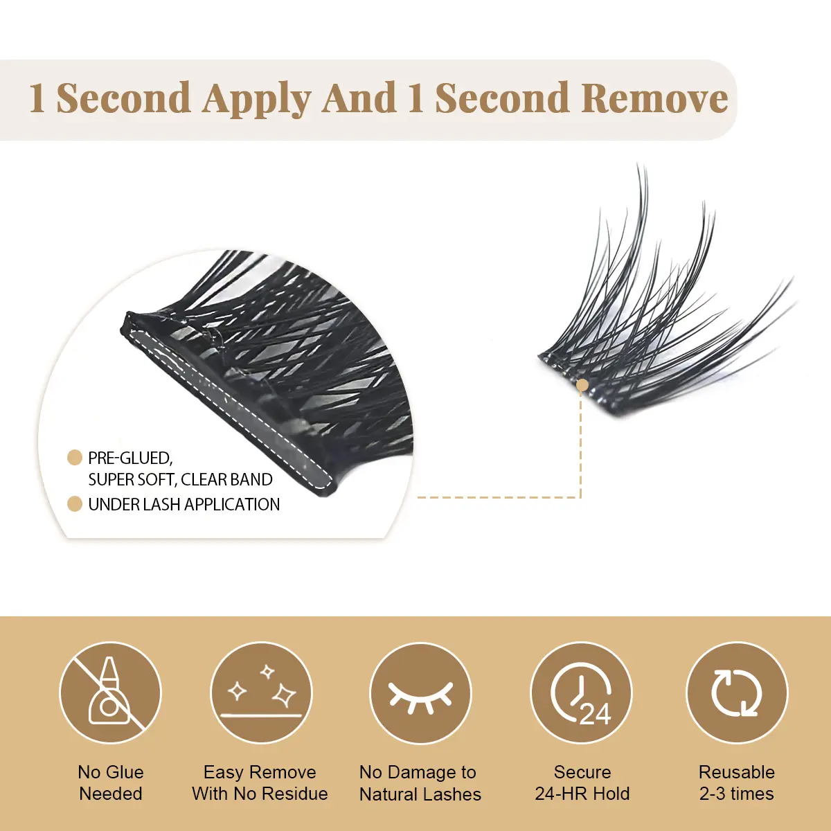 ·1 Step Application: Simply press beneath natural lashes for instant glamour. No glue required!