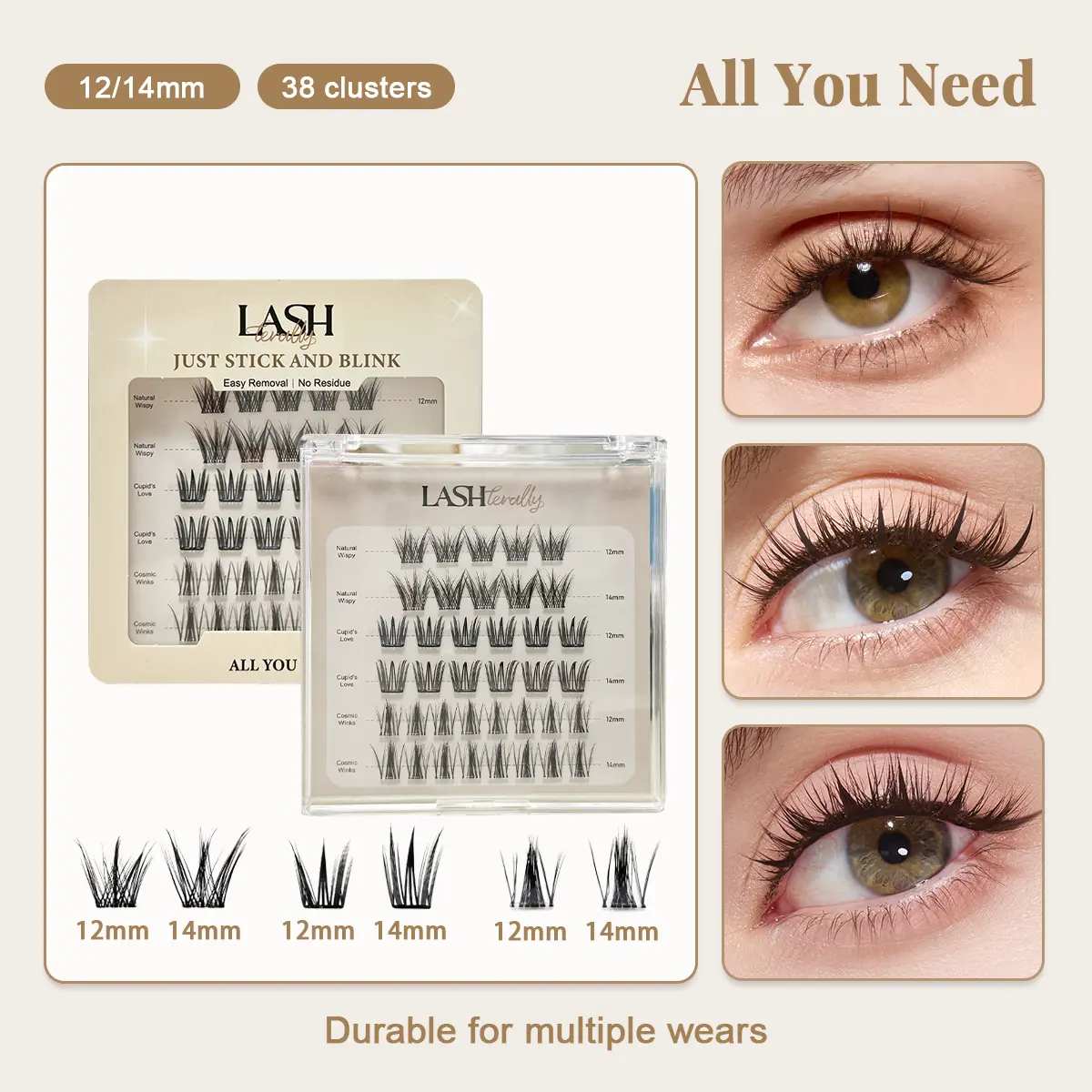 ·Cosmic Winks/Double Dare: 110 lash clusters in three lengths: 22 x Short (10mm); 44 x Medium (12mm); 44 x Long (14mm)