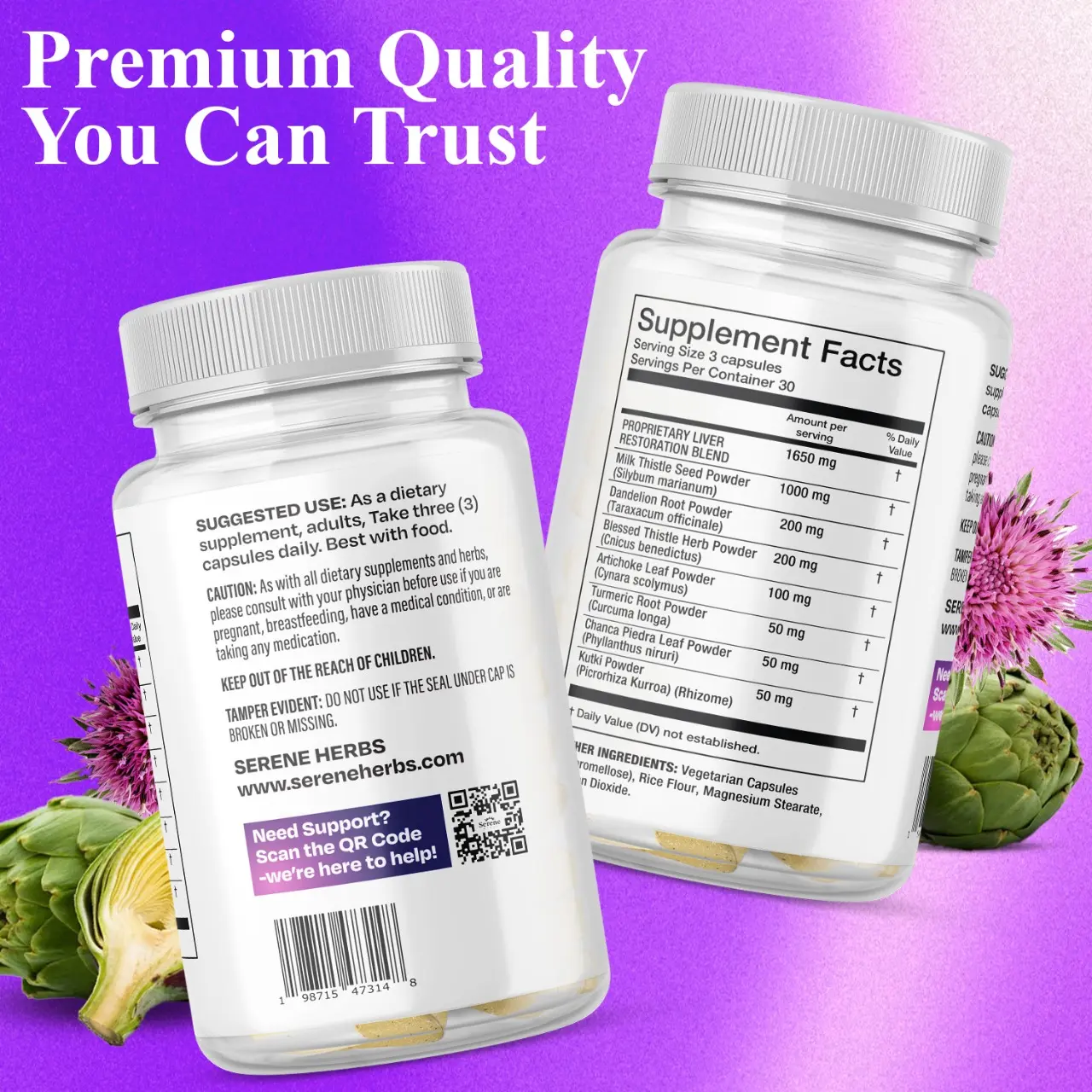 Serene Herbs' advanced liver cleanse detox formula combines Milk Thistle, Artichoke, and Dandelion Root to promote effective liver detoxification and repair. Ideal for fatty liver support and overall liver health, this potent blend helps flush toxins and rejuvenate liver function naturally.