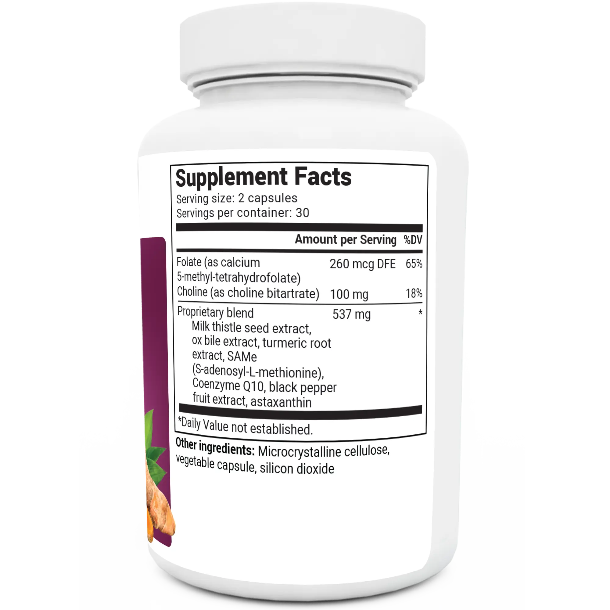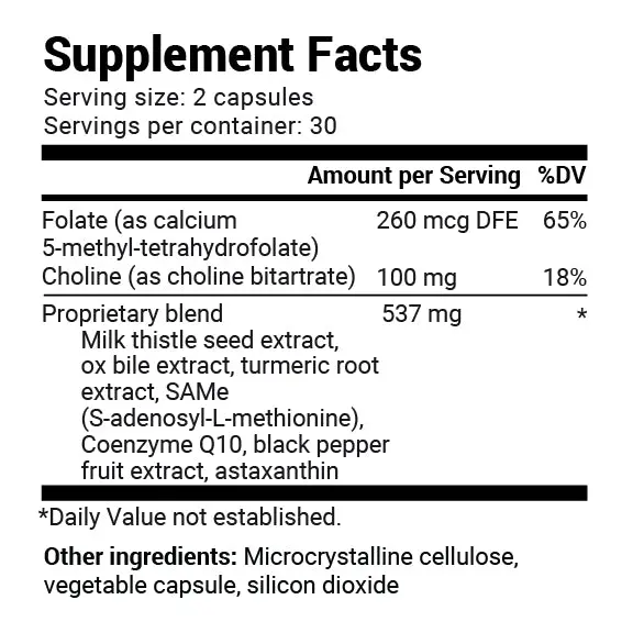 IngredientsFolate (as calcium 5-methyl-tetrahydrofolate), Choline (as choline bitartrate), Proprietary blend (Milk thistle seed extract, ox bile extract, turmeric root extract, SAMe (S-adenosyl-L-methionine), Coenzyme Q10, black pepper fruit extract, astaxanthin)