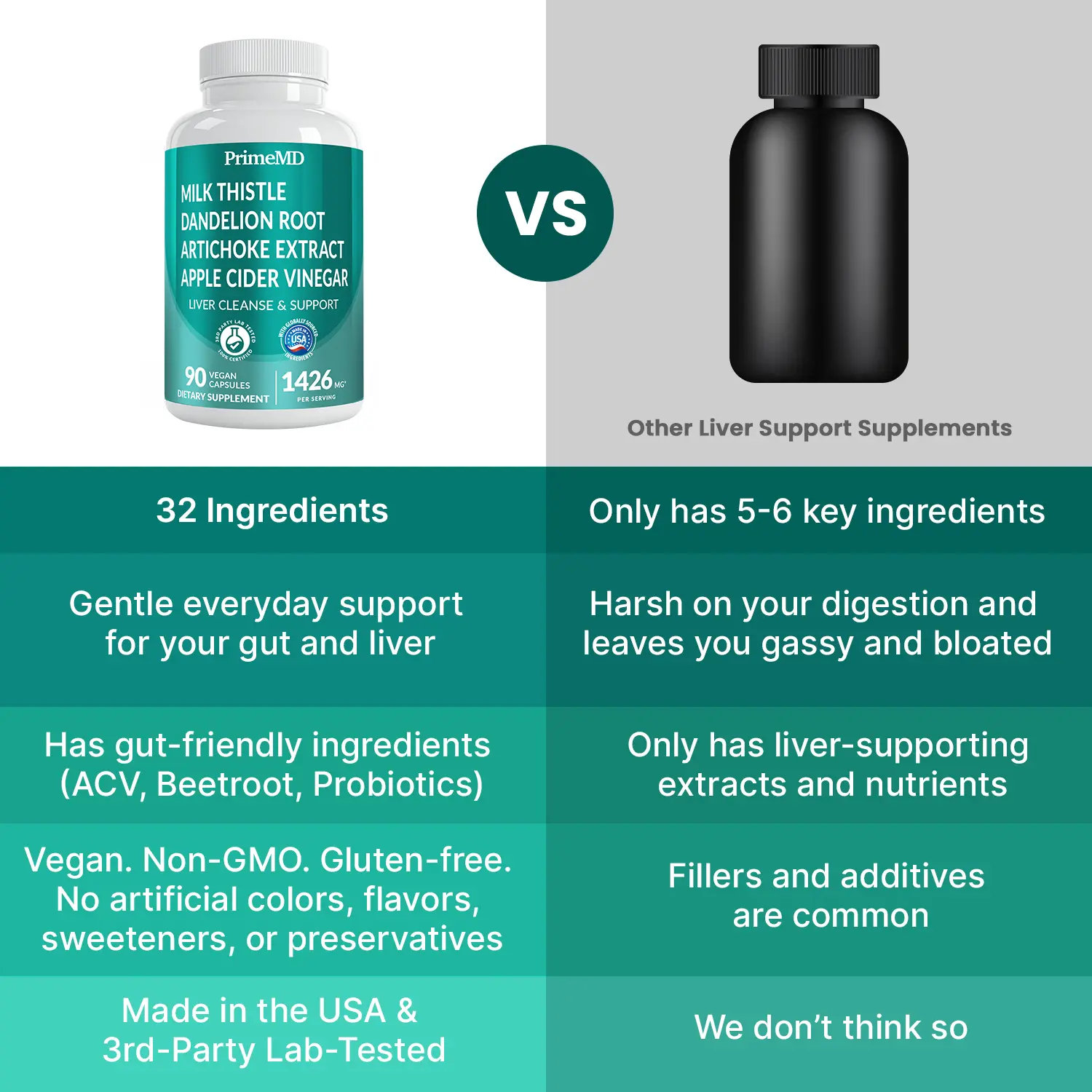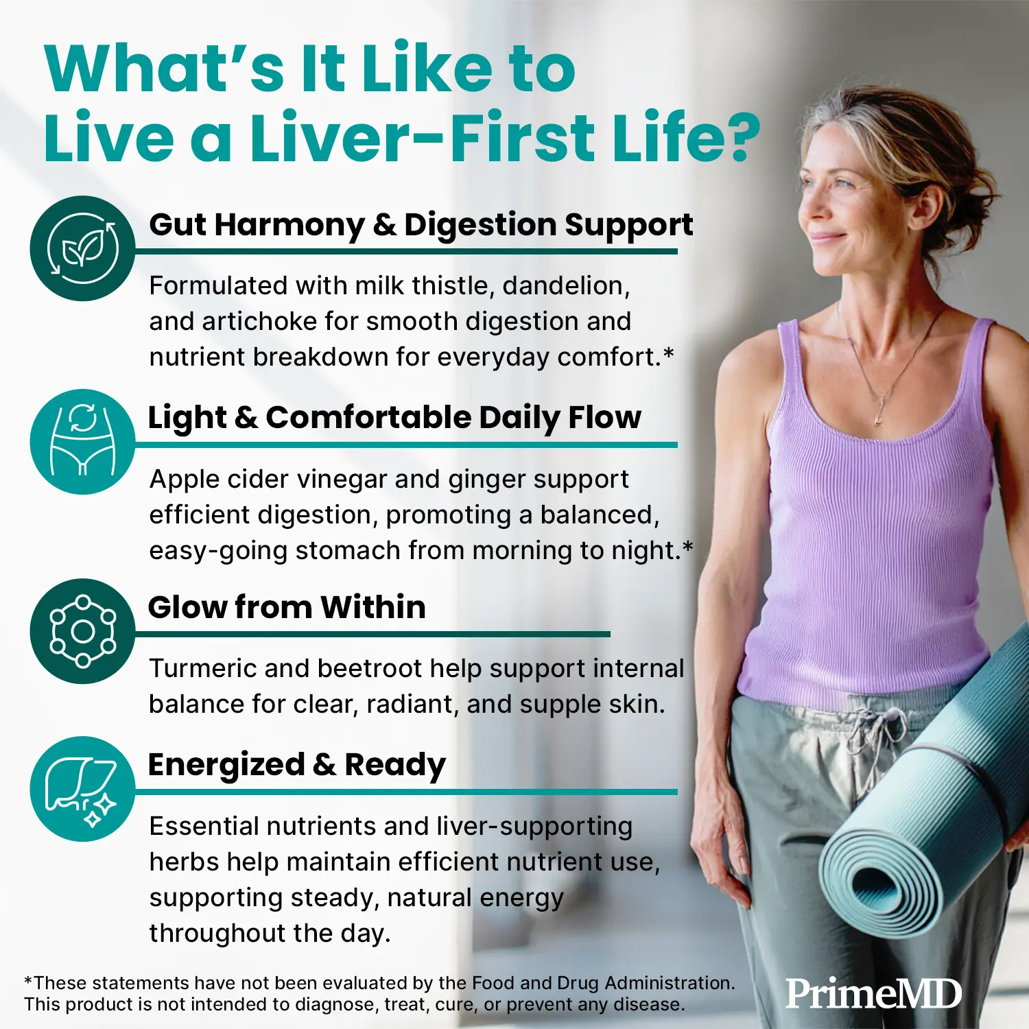 PrimeMD Liver Cleanse & Support is a 32-in-1 formula designed for adults seeking dependable gut and liver support in one simple daily step. This multi-system blend features Milk Thistle, Dandelion, Artichoke, Beet Root, Apple Cider Vinegar, Ginger, Turmeric, and a probiotic support blend to help maintain digestive comfort, natural bile activity, and efficient nutrient use. Together, these botanicals assist internal balance that may reflect in clearer energy, smoother daily flow, and a refreshed overall feeling.