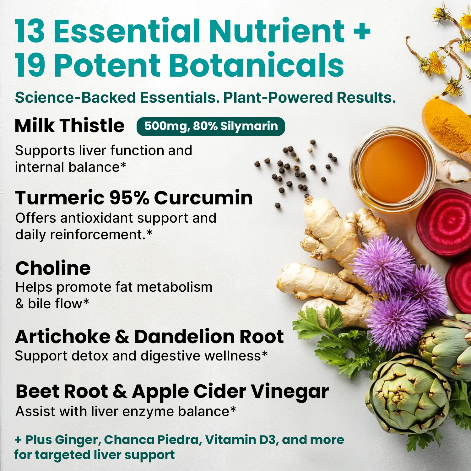·Comprehensive Gut & Liver Formula: This 32-in-1 daily formula combines Milk Thistle, Dandelion, Artichoke, Apple Cider Vinegar, Turmeric, and ginger to support smooth digestion, vibrant-looking skin, and steady daily energy.