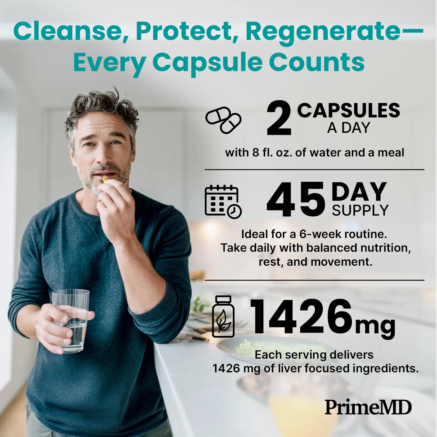 Take 2 capsules daily with a meal and water to support smooth digestion, nutrient breakdown, and coordinated gut-liver activity. Designed for those who want a simple, reliable addition to their wellness routine, PrimeMD Liver Cleanse & Support offers inside-out support that fits easily into busy lifestyles