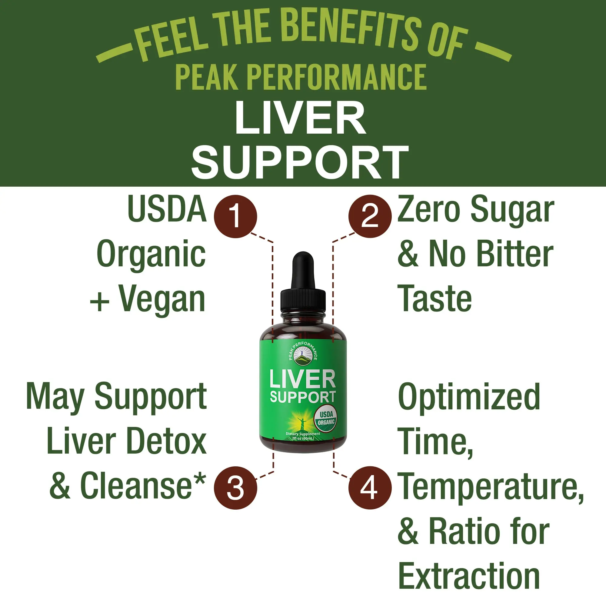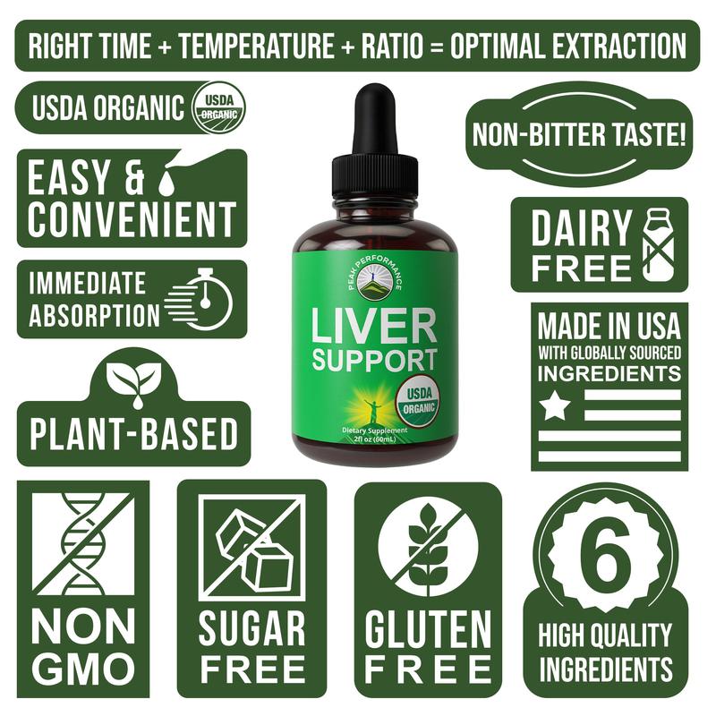 Not all Liver health and support supplements on the market are Organic - Peak Performance Liver Support liquid tincture supplement for women and men is USDA Certified Organic. You get 6 of the best and highest quality liver ingredients we could find. We created a balanced, absorbable formula with optimized time, temperature, and ratio for extraction.