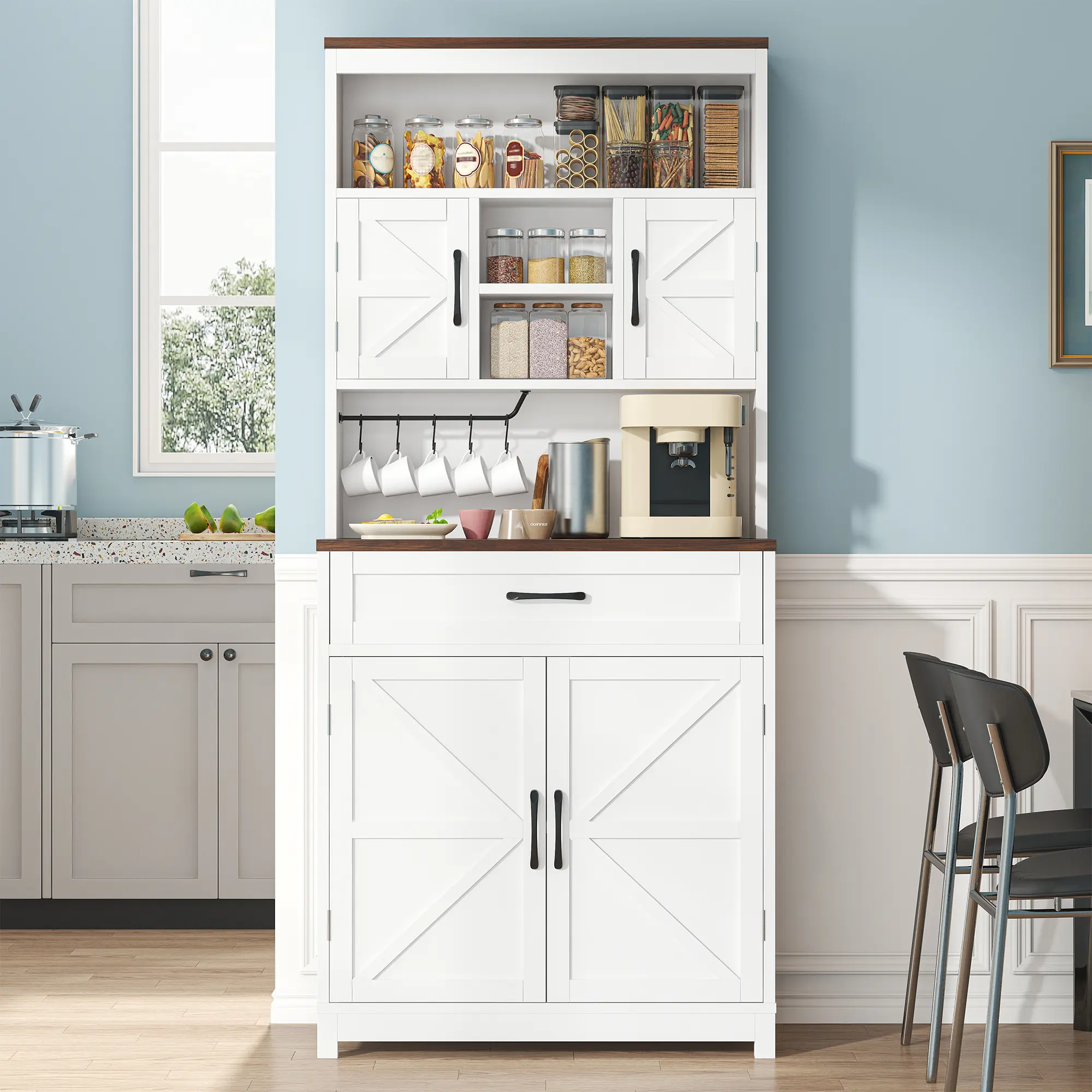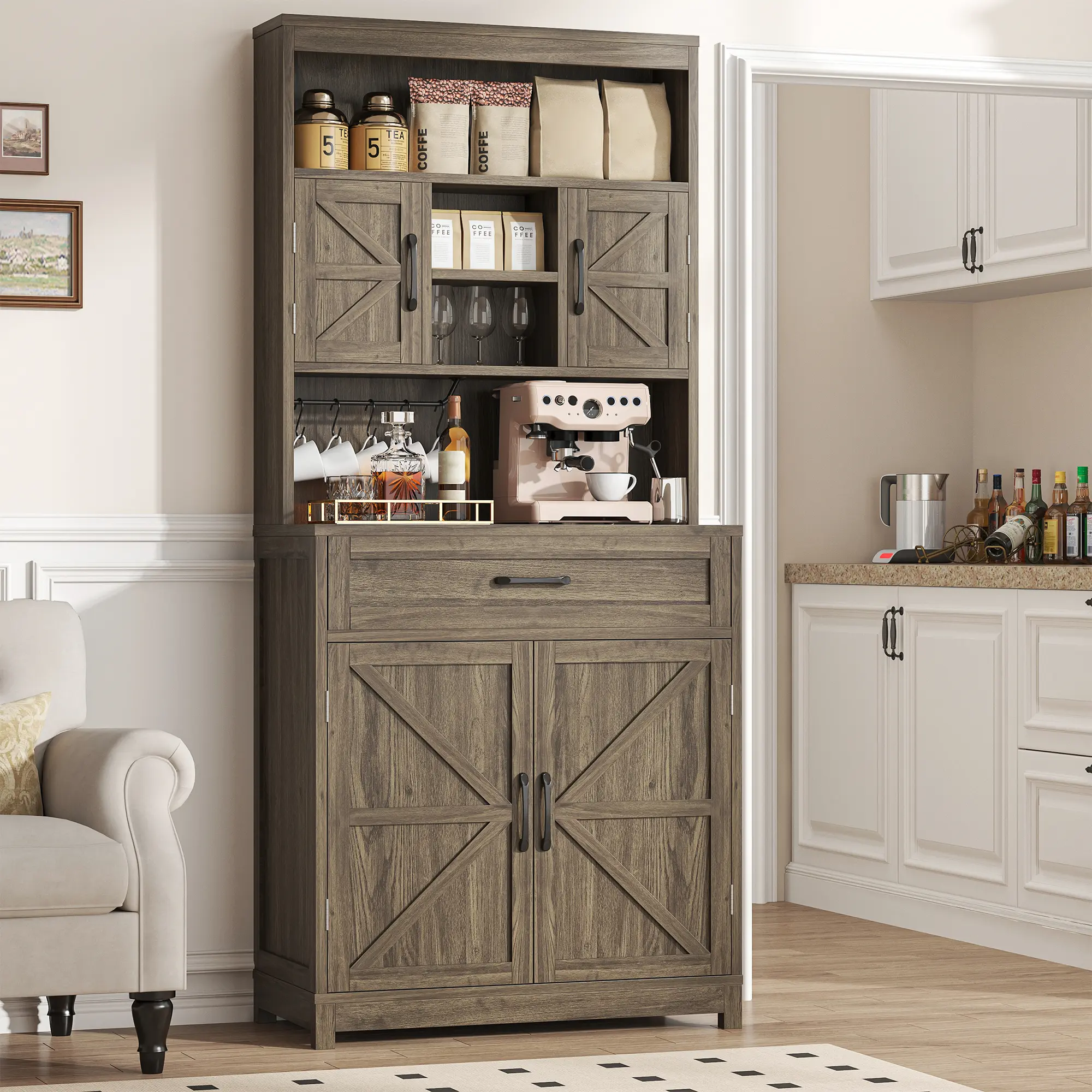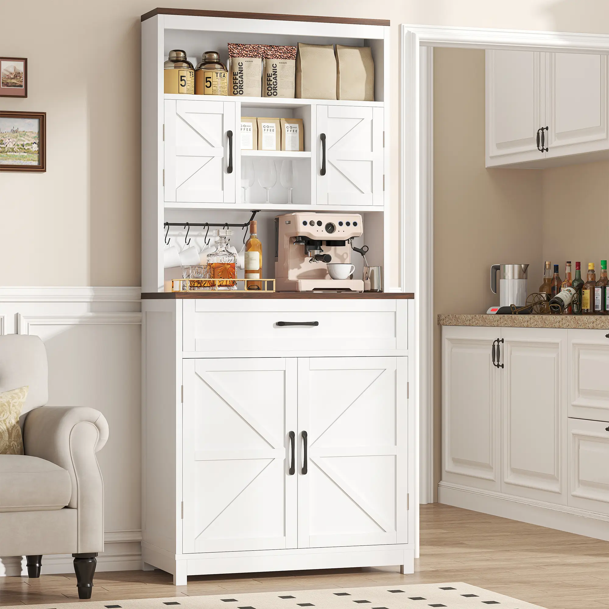 ✨ 69.3" Tall Kitchen Pantry Cabinet - This farmhouse-style cabinet offers ample storage with 2 barn doors, 1 drawer, and storage shelves. Perfect for kitchen organization, it features a wide countertop and charge holes. Ideal for buffets and kitchen hutch needs.
