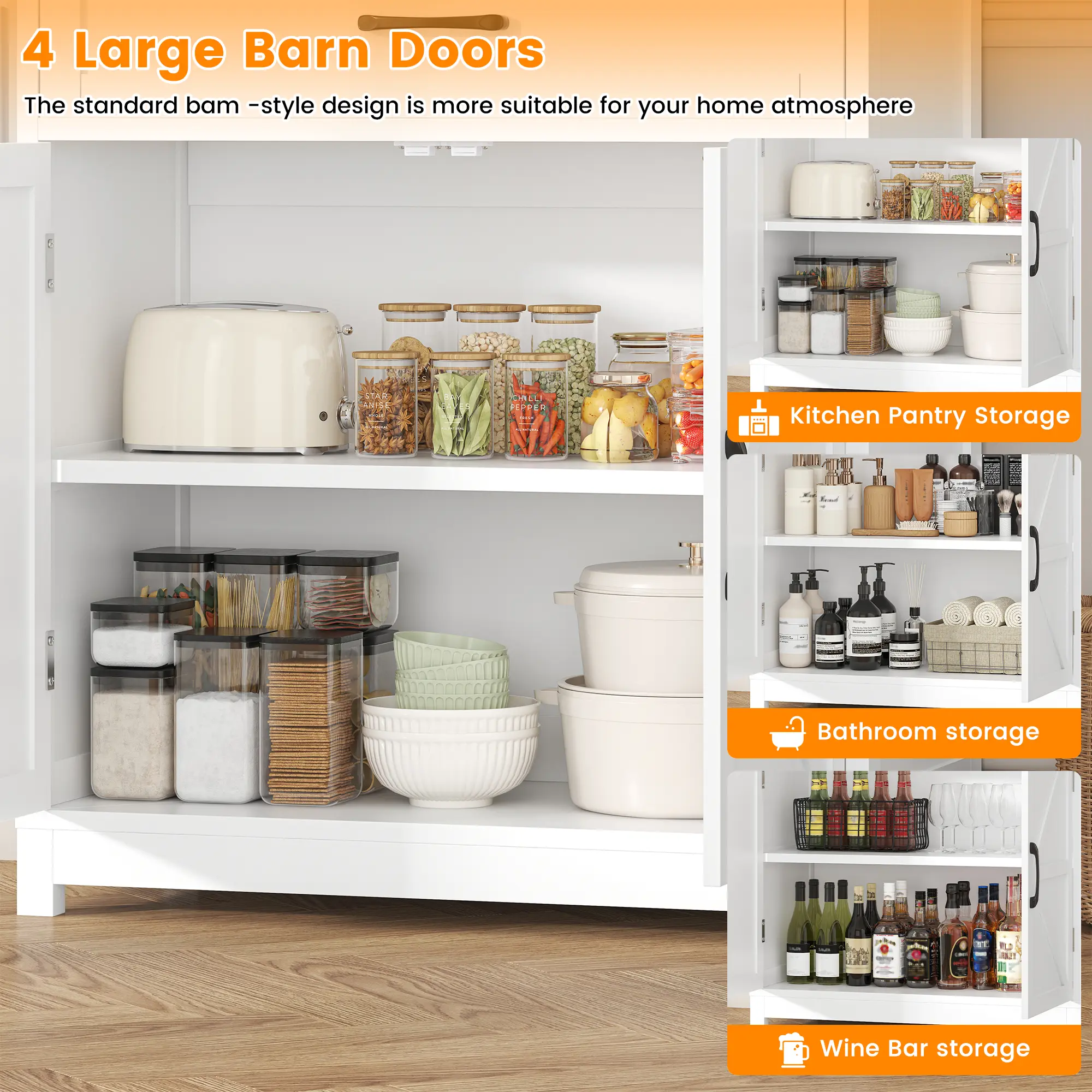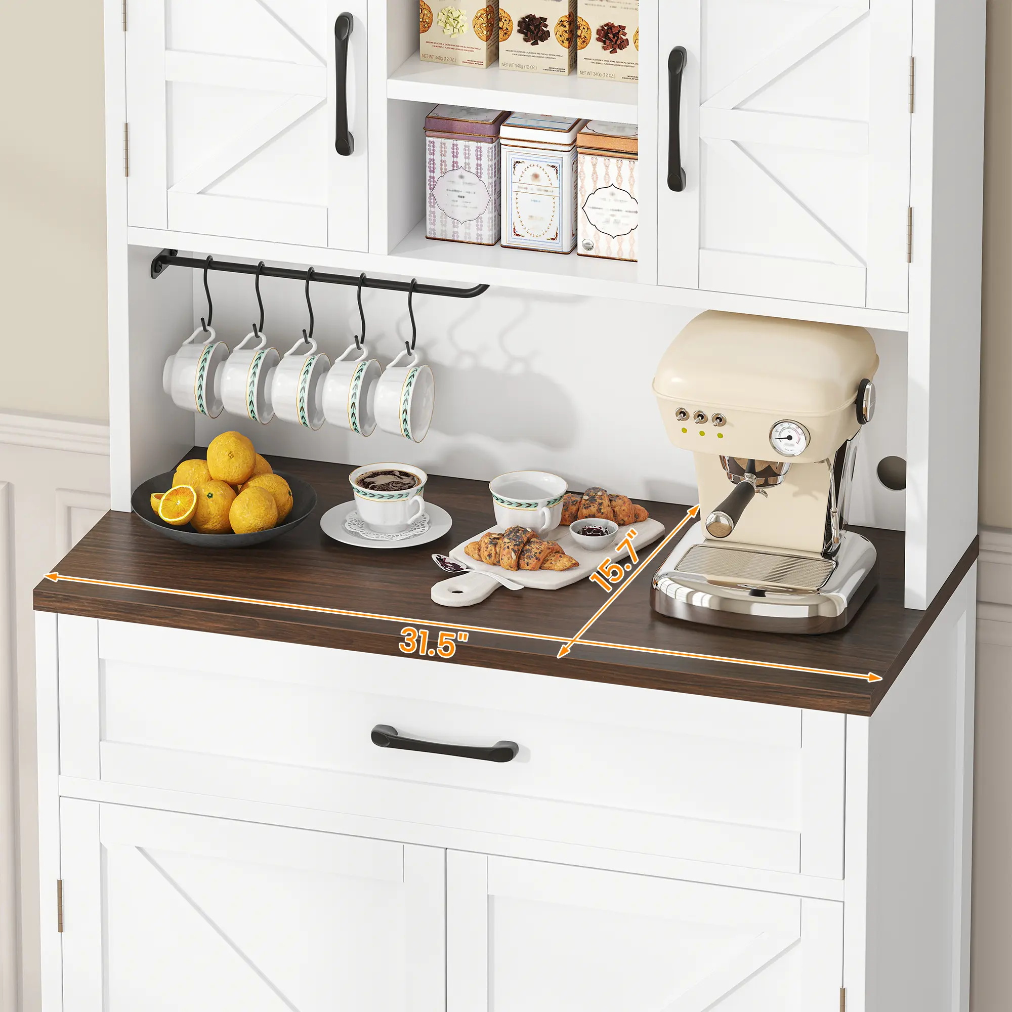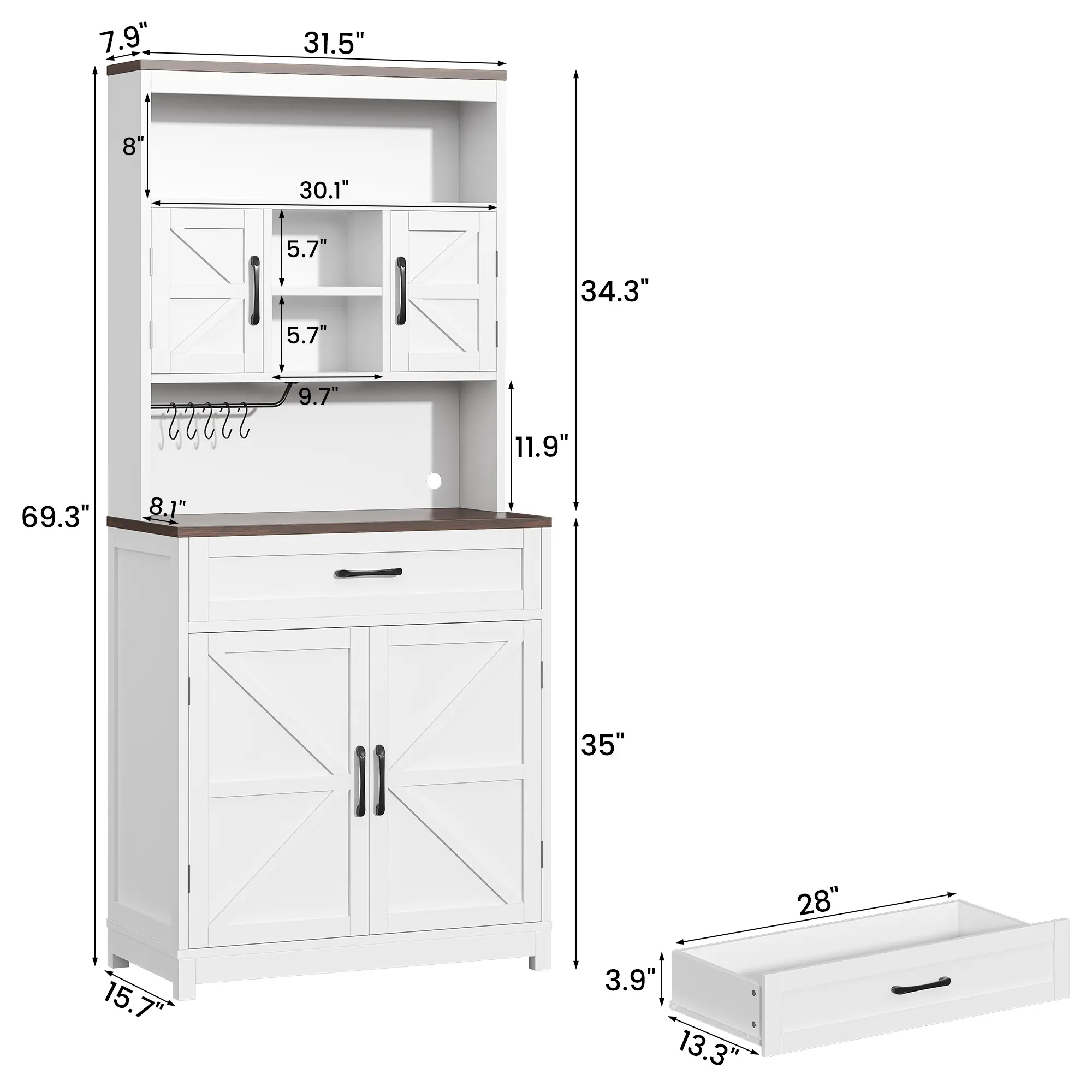 ✨ 69.3" Tall Kitchen Pantry Cabinet - This farmhouse-style cabinet offers ample storage with 2 barn doors, 1 drawer, and storage shelves. Perfect for kitchen organization, it features a wide countertop and charge holes. Ideal for buffets and kitchen hutch needs.