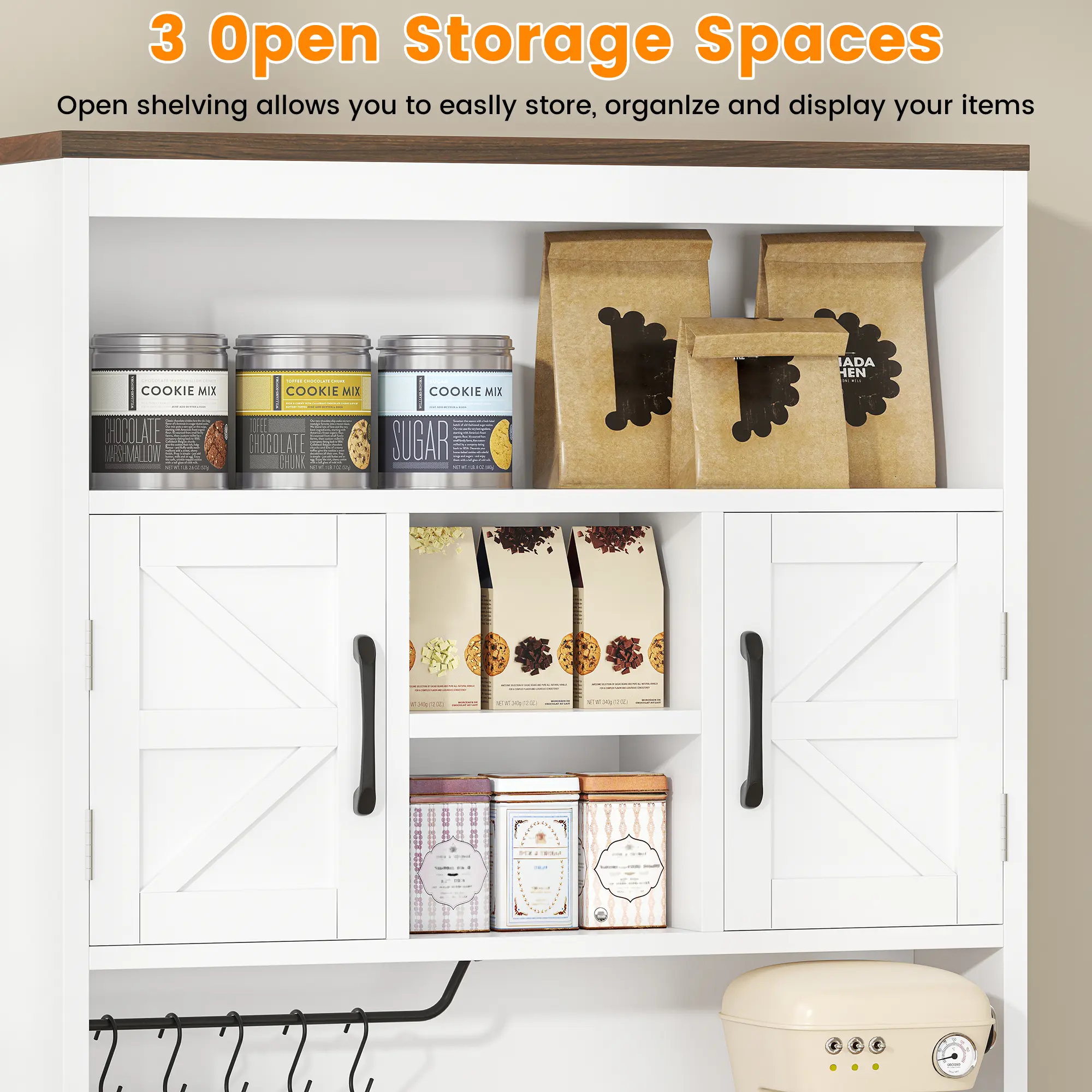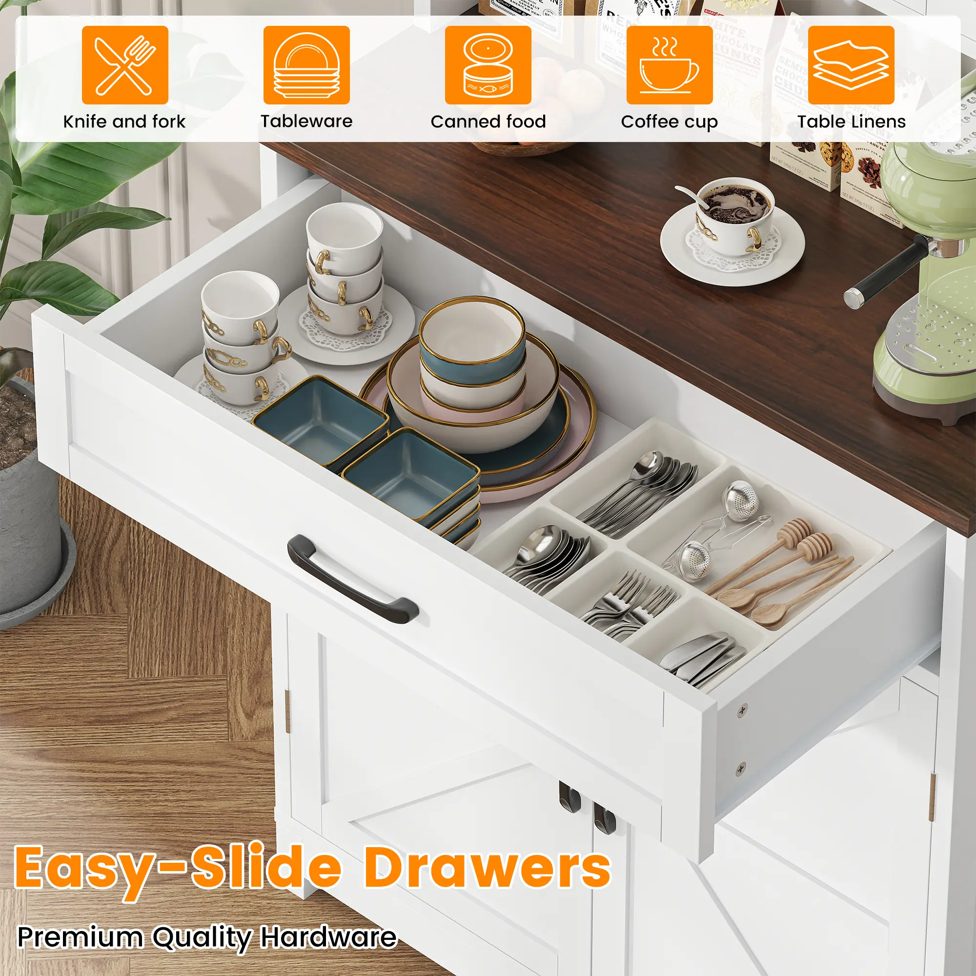 This cabinet combines functionality with a farmhouse aesthetic. It is perfect for kitchens needing extra storage and organization. The wide countertop and charge holes make it a versatile piece for buffets and kitchen hutch use.