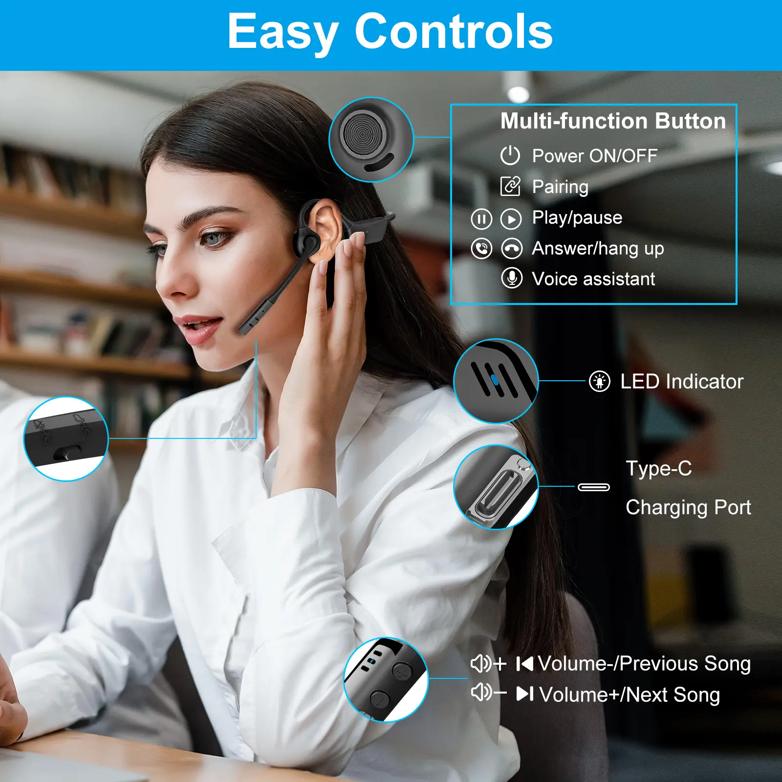 ·Easy to use & Large battery:This air conduction headphones with mic feature multifunction button that can easily control play, pause, answer a call, end a call, next song, last song and activate voice assistant. You can also adjust the volume via the volume button of the bluetooth headset with microphone. Enjoy up to 8 hours of talk time or 10 hours of listening time after a single full charge(2 hours) to support your all-day work time.