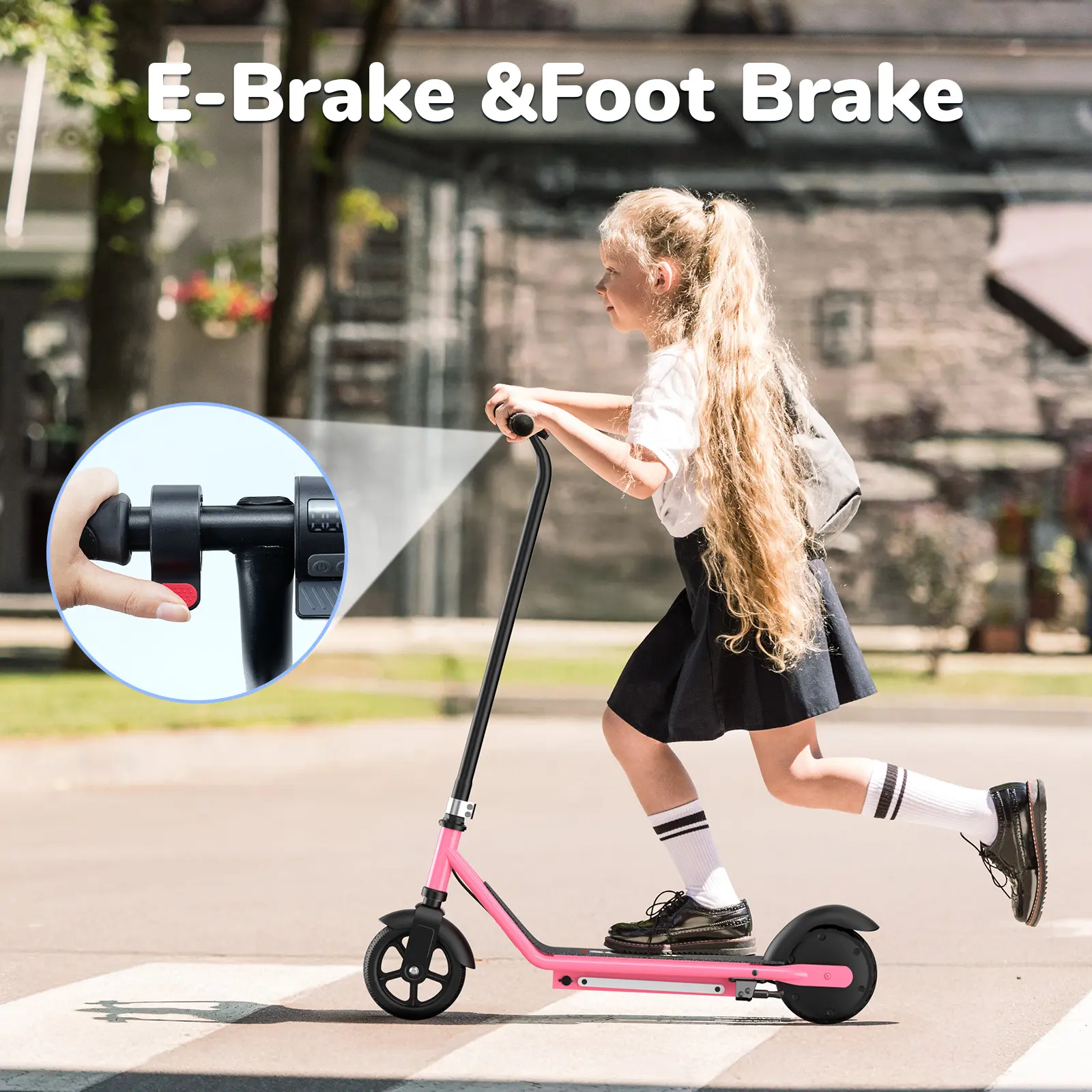 E-brake + foot brake work together to stop the scooter instantly, even at full speed. The extended rear fender keeps kids clean by blocking mud and water on wet roads.