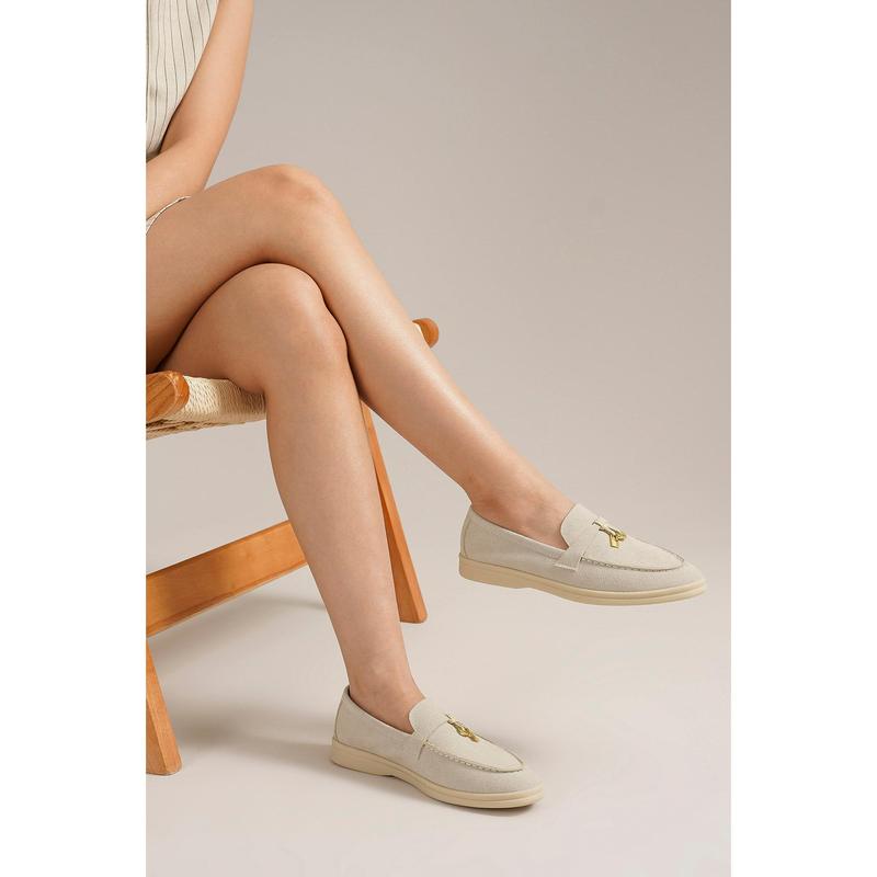 Material: Faux suede with metallic gold accent Heel Height: Flat sole Closure: Slip-on style Fit: True to size Style: Perfect for office wear, casual outings, or polished everyday looks