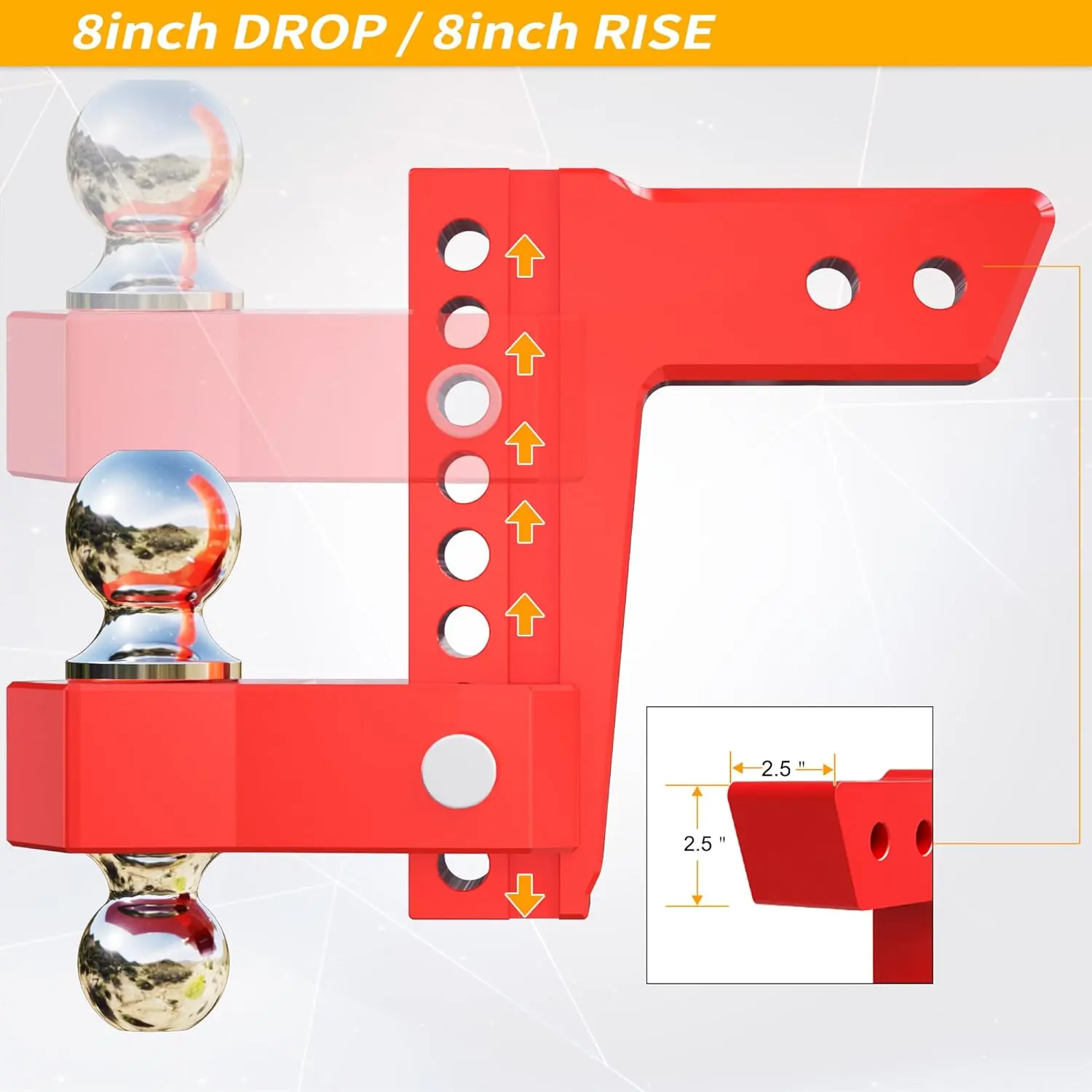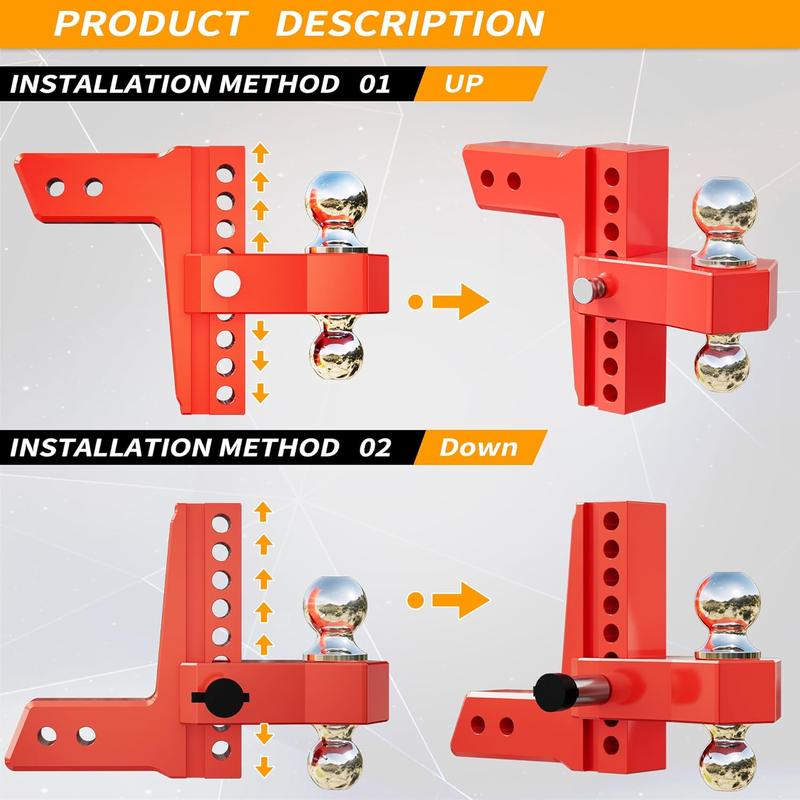 ·Integrated Structure: Integrated hitch balls allow for supreme towing capacity while 8" drop/rise hitches offer flexible adjustment. The pins hold hitch balls in place and allow for a quick change-out system