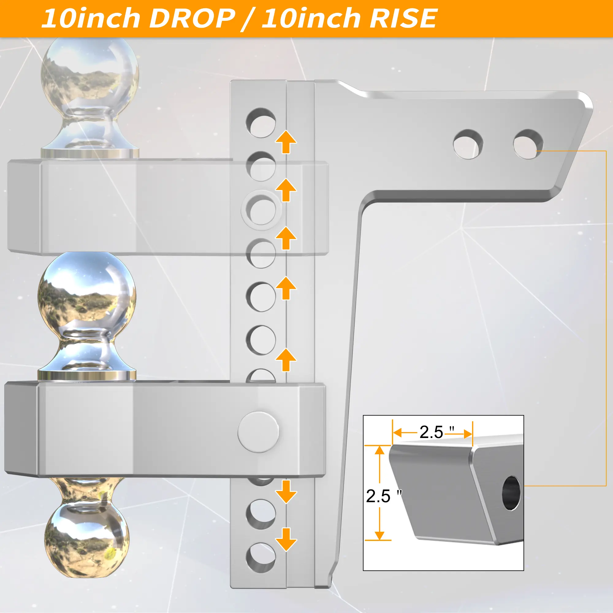 Quick-Change System → Integrated balls + 10" drop/rise + secure pins = flexible & fast setup.