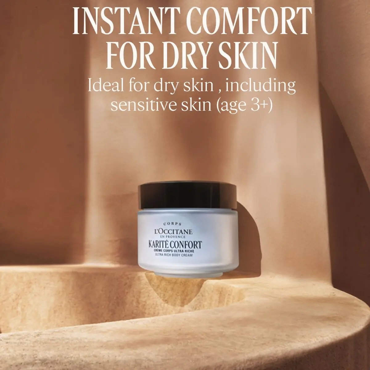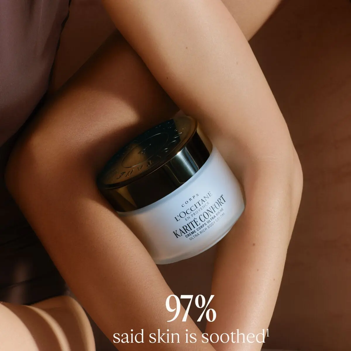 Indulge your skin in a luxurious sensory experience with the Karité Confort (Shea Butter) Ultra Rich Body Cream, a creation designed to deliver intense hydration and comfort from day to night. Infused with 25% Shea Butter, this rich yet fast-absorbing cream melts effortlessly into the skin, helping soothe & moisturize dry skin, and protecting the skin’s natural barrier.