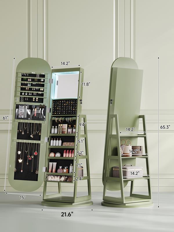 ·Stylish 360° Swivel Full Length Mirror: Easily access your jewelry collection from all angles with the convenient 360° rotating feature. Elevate your space with this modern arched jewelry cabinet, featuring an extra-wide floor-length mirror that offers a flawless full-body view. Its curved silhouette adds a chic, contemporary touch to bedrooms, walk-in closets, or entryways, blending style with everyday practicality