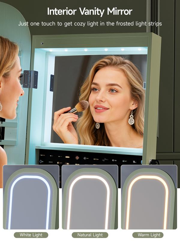 ·Inside Makeup Mirror with LED Lights: Convenient for make-up/jewelry fitting/skin care, no need to open & close the door frequently to use the full body mirror. Touch the switch to turn on the light, the LED lights will turn on automatically as the door opens. The three-color extended LED light strip (White Light, Warm Light and Blue Light) is controlled by a circular touch button (It requires 3 AA batteries, not included)