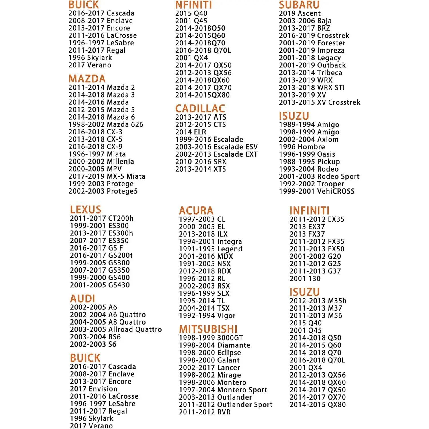 COMPATIBLE WITH:【INFINITI 】:Q40 Q45 Q50 Q60 8Q70 Q70L QX4 QX50 QX56 QX60 QX70 QX80 CADILLAC 】:ATS CTS ELR Escalade Escalade ESV Escalade EXT SRX XTS【SUBARU】:Ascent Baja BRZ Crosstrek Forester Impreza Legacy Outback Tribeca WRX WRX STI XV XV Crosstrek【ISUZU】:Amigo Amigo Axiom Hombre Oasis Pickup Rodeo Rodeo Sport Trooper VehiCROSS 【AUDI 】: A6 A6 Quattro A8 Quattro Allroad Quattro RS6 S6