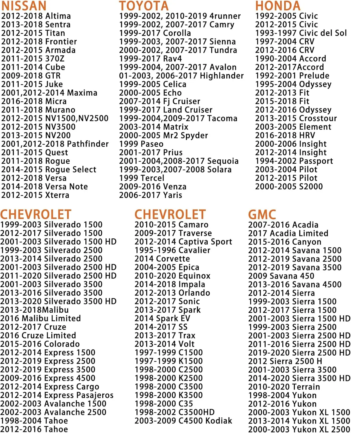 COMPATIBLE WITH:【TOYOTA 】4runner Camry Corolla Sienna Tundra Rav4 Avalon Highlander Celica Echo Fj Cruiser Land Cruiser Tacoma Matrix Spyder Paseo Prius Sequoia Solara Tercel Venza Yaris【HONDA 】:Civic Civic del Sol CRV Accord Prelude Odyssey Fit Crosstour Element HRV Insight Passport Pilot S2000【NISSAN 】:Altima Sentra Titan Frontier Armada 370Z Cube GTR Juke Maxima Micra Murano NV1500,NV2500 NV3500 NV200 Pathfinder Quest Rogue Rogue Select Versa Versa Note Xterra