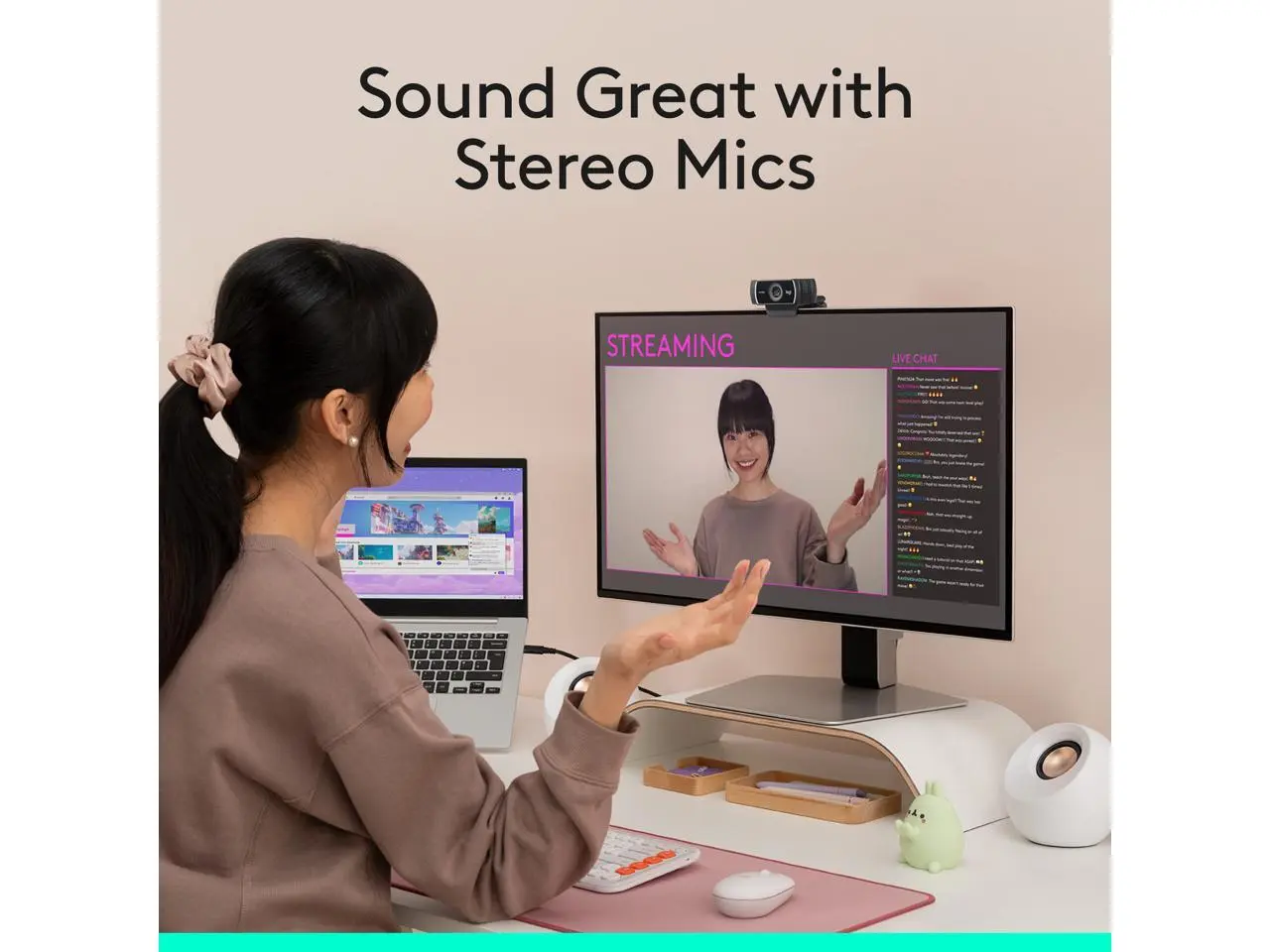 - Two omnidirectional mics capture stereo audio from every angle, ensuring clear, nodrop streaming and recorded video.