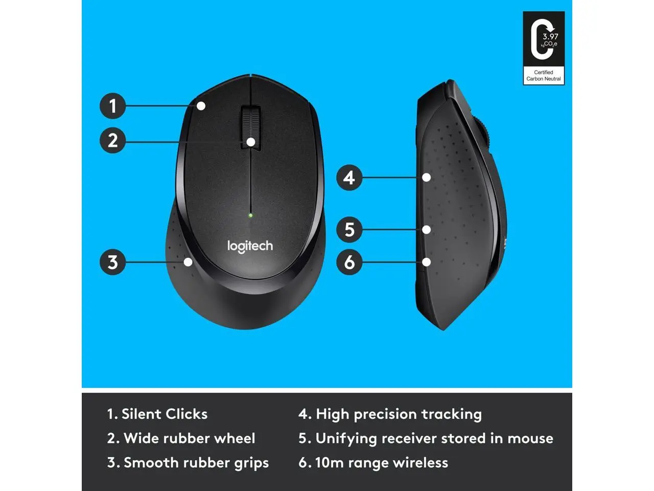 - Logitech M330 Silent Plus wireless mouse operates silently, limiting noise.