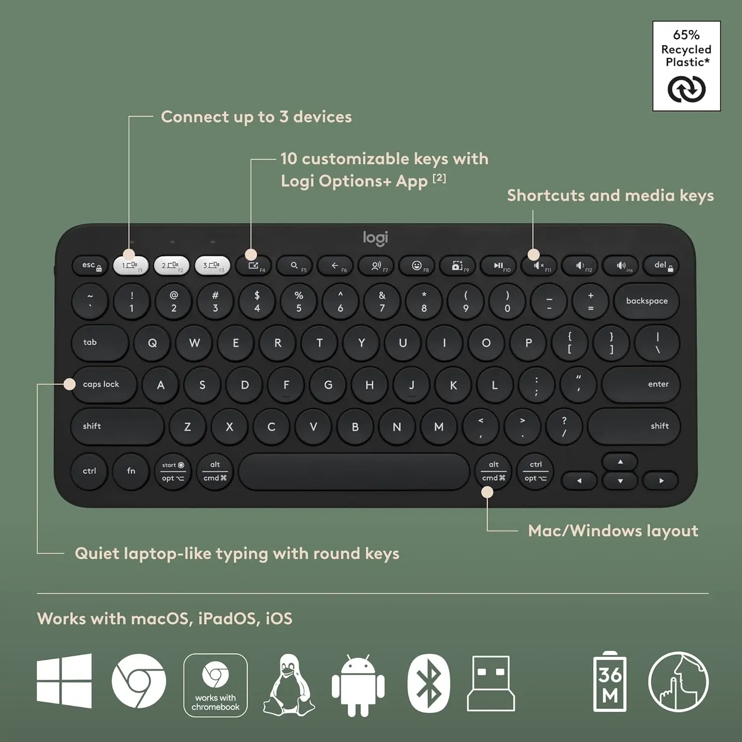 Defy Boring with the iconic Slim Bluetooth Combo. The slim keyboard and mouse combo comes in a choice of fresh, matching colors – made with recycled plastic(1). Pick the one that suits your vibe. The Slim Bluetooth Combo’s minimalist, sleek, and lightweight keyboard and mouse design makes it as iconic as you and super portable to take wherever you go. Easily hop across devices and switch between up to 3 wireless devices across OS (Windows, macOS, iPadOS, ChromeOS, Android) with a press of a button. Personalize the mouse’s middle button(2) to assign shortcuts for your favorite apps like shuffling your Spotify playlist or sending emojis on WhatsApp and customize the 10 keyboard Fn shortcut keys to work how you want and save time with shortcuts in Logi Options+ App(2). The wireless keyboard also features Fn shortcut keys such as screen capture, search, voice dictation, and emoji menu to free up your time. Let your work speak louder than your typing and clicking with Slim Bluetooth Combo. The Pebble Mouse 2 M350s is a quiet mouse with Silent Touch Technology that reduces click noise by 90%(3). Type quietly with the keyboard’s low-profile keys for laptop-like typing. Get hours of use with the Bluetooth® keyboard coming with a 3-year battery(4) and the mouse with a 2-year battery(4) to keep you going for longer. Batteries included.