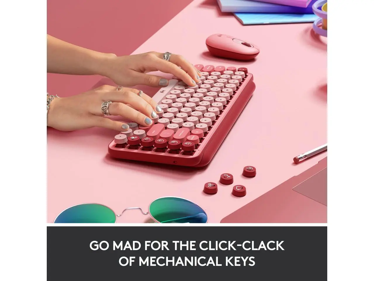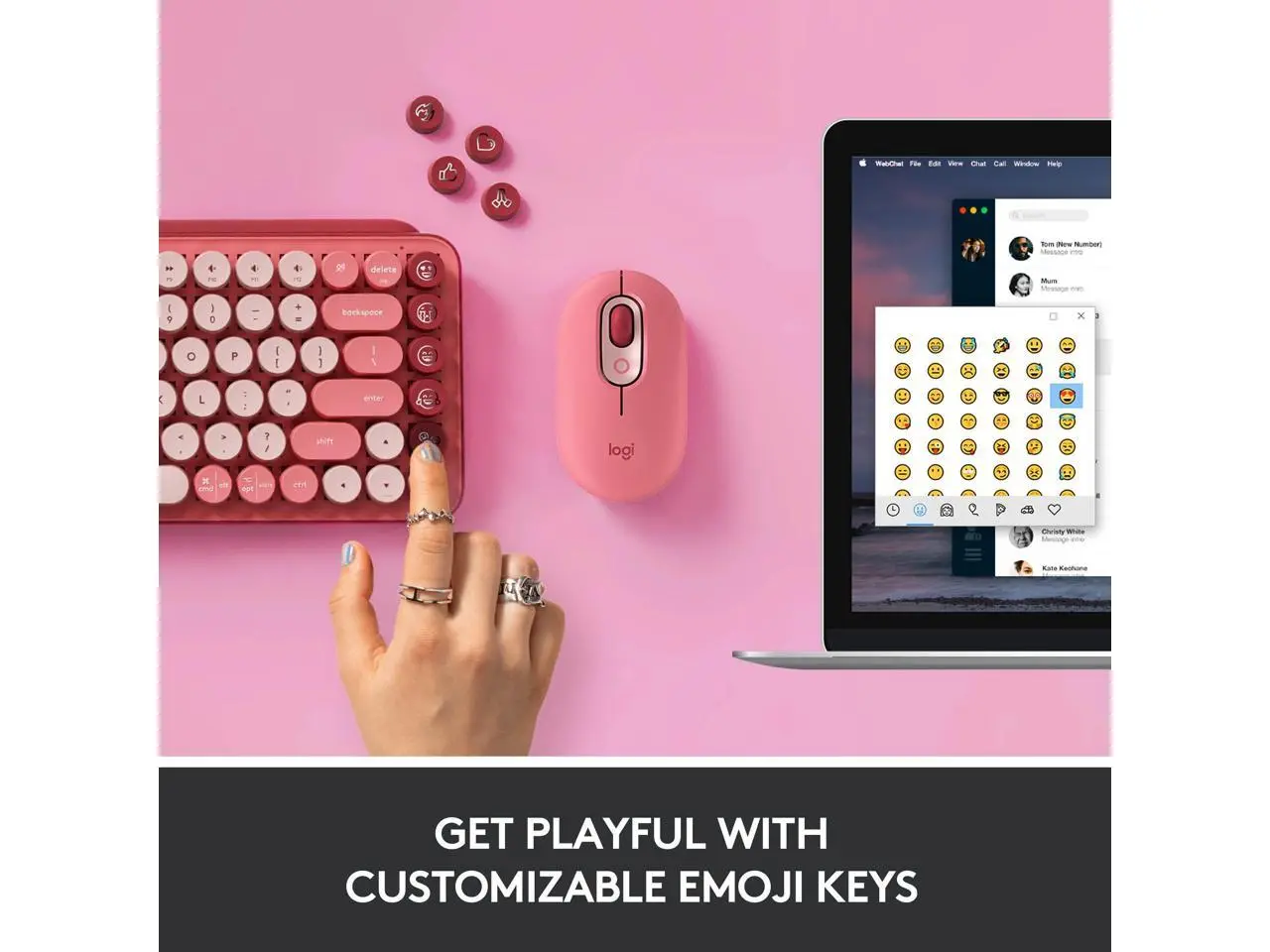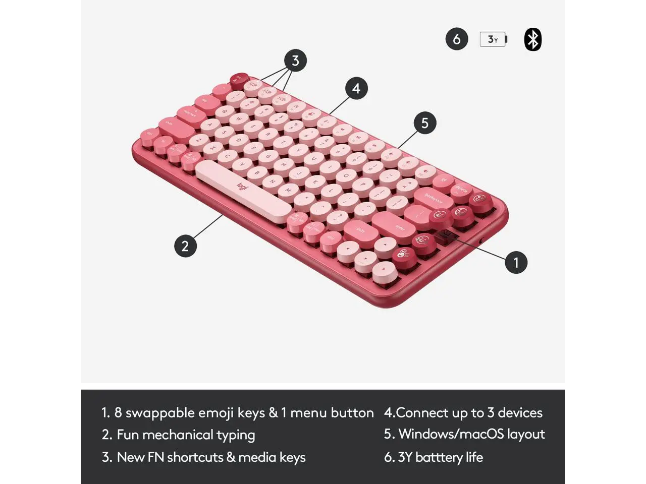 ·PERSONALITY THAT POPSUnleash personality onto your deskspace and beyond with POP Keys. Together with a matching POP Mouse, let your true self shine with a statement desktop aesthetic and fun customizable emoji keys.BLASTGET LOUD, GET RETRO.Shout your inner retro out loud with a bold combination of black, grey and arcade game yellow. Make a performance with POP Keys in Blast.KEY FEATURES | FEELINGS AT YOUR FINGERTIPSHappy? Angry? In love? POP Keys comes with eight swappable emoji keys which you can easily mix and match to suit your mood. You can assign these to any existing emoji you like using Logitech Software, or tap the emoji menu key to choose from the full range of emoji as you chat with friends.GO MAD FOR MECHANICALExperience typing thats almost addictive on typewriter-style mechanical keys. Feel your fingers bounce across the keys, and hear the mechanical switches click, clack and pop with every press. Old-school and oh-so satisfying.FN COOL NEW SHORTCUTSDont be fooled by POP Keys vintage aesthetic. Its 12 new FN shortcuts give you what you really need today - helping you snip screen, trigger Voice-to-Text , and Mute your mic in a long meeting, and much more at the tap of a key.CONNECT TO THREE DEVICES AT ONCEUnleash your personality across multiple devices at a time using POP Keys Easy Switch keys-which let you pair up to 3 devices and switch typing between them with a single tap. Connect to your computer, tablet or phone using Bluetooth® wireless technology or Logi Bolt USB receiver.It works on Windows®, macOS, Chrome OS™, Android™, iOS, and iPadOS.COMPACT AND COMFYAll the keys you need on a space-saving frame. Scooped round keys match the shape of your fingertips for snug and smooth touch-typing. Plus, POP Keys compact design lets you place your mouse closer for less arm reaching, more comfort, and better body posture.YOURS FOR THE LONG HAULIn true Logitech fashion, POP Keys is designed to last. With up to three years battery life and keys that can endure up to 50 million strokes (thats a lot), you can create, chat, and express yourself to your hearts content.RY THE FULL SELF-EXPRESSION EXPERIENCEOwn your space with the right accessories to take your productivity and style to new levels. Discover POP Mouse, StreamCam, G733 and Logitech Desk Mat.More from the Manufacturer
