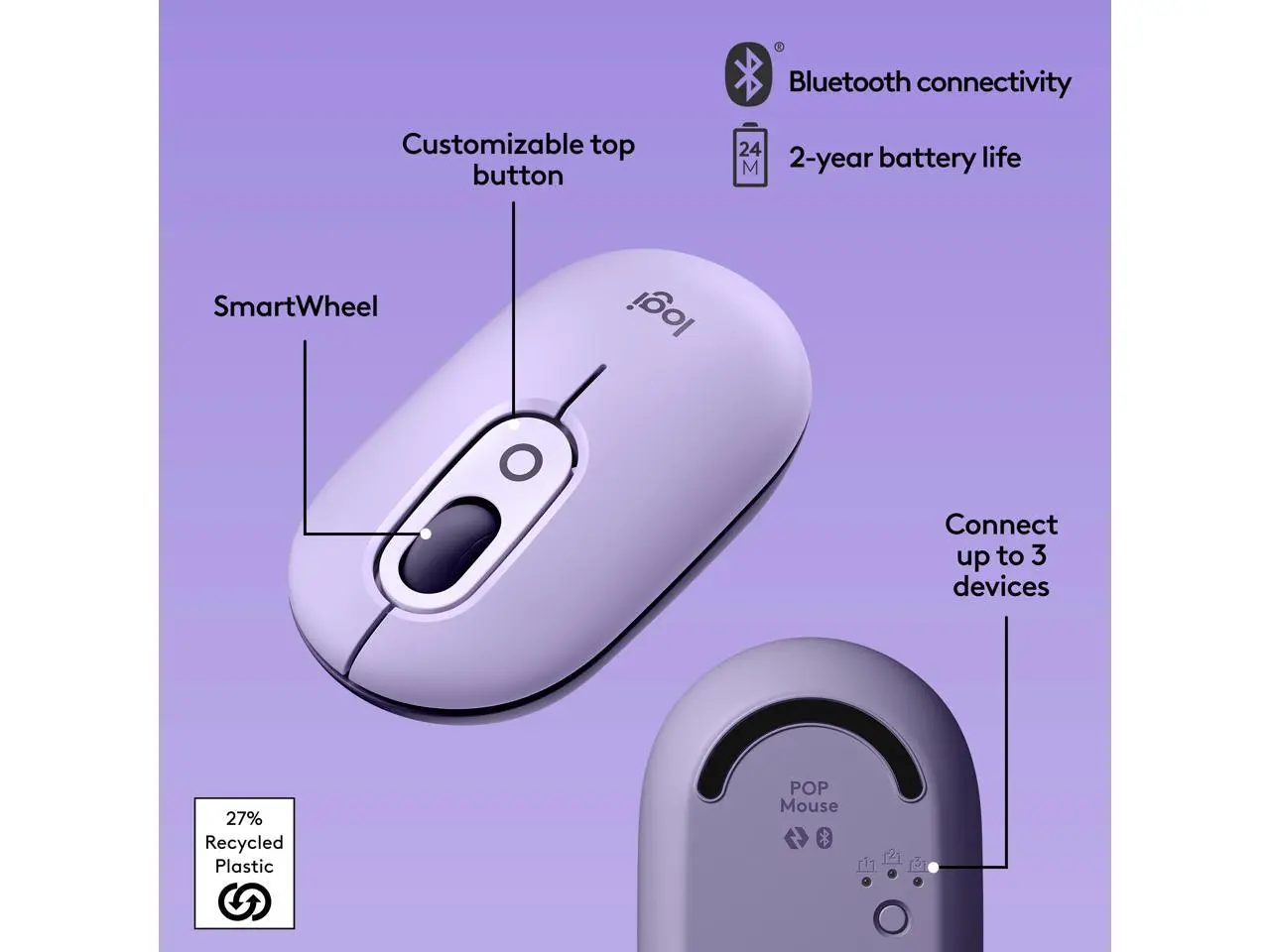 ·Get to know the playful, wireless POP Mouse, designed to make personality shine on your desktop and beyond. Pick the POP Mouse you love most from our range of designs, and make it your own with fun emoji customization. With SilentTouch clicks, and up to 24 months battery life, take it anywhere you go. Connect POP Mouse to your desktop, laptop, or tablet using Bluetooth® on Windows®, macOS, iPadOS and Chrome OS. Glide between up to 3 devices at a time with FLOW™, and shift instantly from high-precision to speed scroll mode with the SmartWheel.