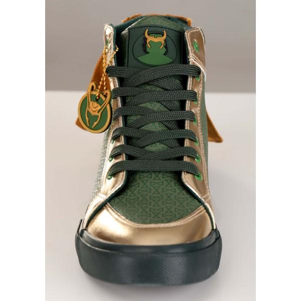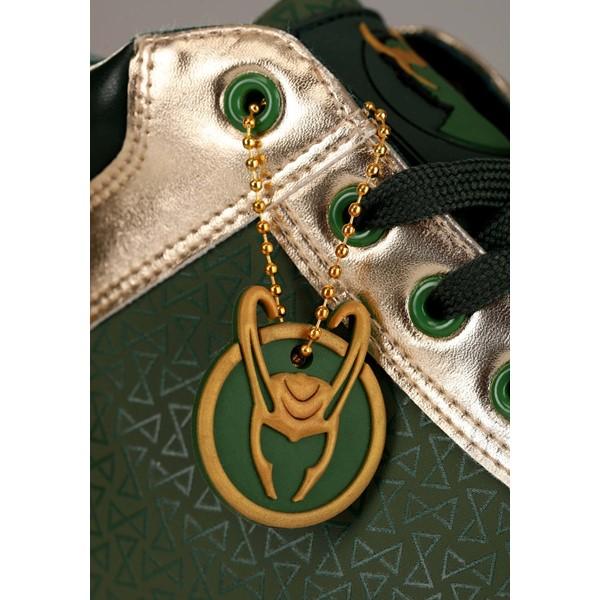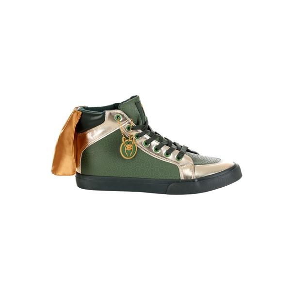 Loki can be a part of your every day life, too, when you bring home the newest variant in the form of these Marvel Loki God of Mischief Shoes! Here, you've got rubber soles for secure footing, faux leather tops detailed with geometric designs, and the iconic symbol of Loki's helmet. But that's not all. The proof of the Loki love is in the satin cape sewn to the back of each shoe! What devious plans do these sneaky sneakers have? Well, that's for you to discover!