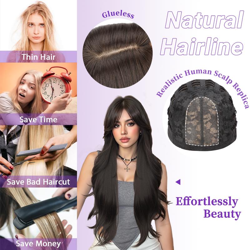 [ AISI HAIR ] Long Dark Brown Wig for Women 2x4 Realistic Scalp Free Parting Layered Heat Resistant Synthetic 28 inch for Daily Party Use