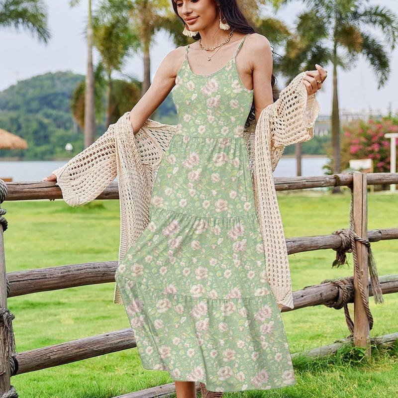 ·【Features】: Women's summer casual dress, adjustable spaghetti strap, crewneck, maxi length, tiered design, a line, flowy swing hem, floral/black, relax fit and 2 side pockets cami dress.