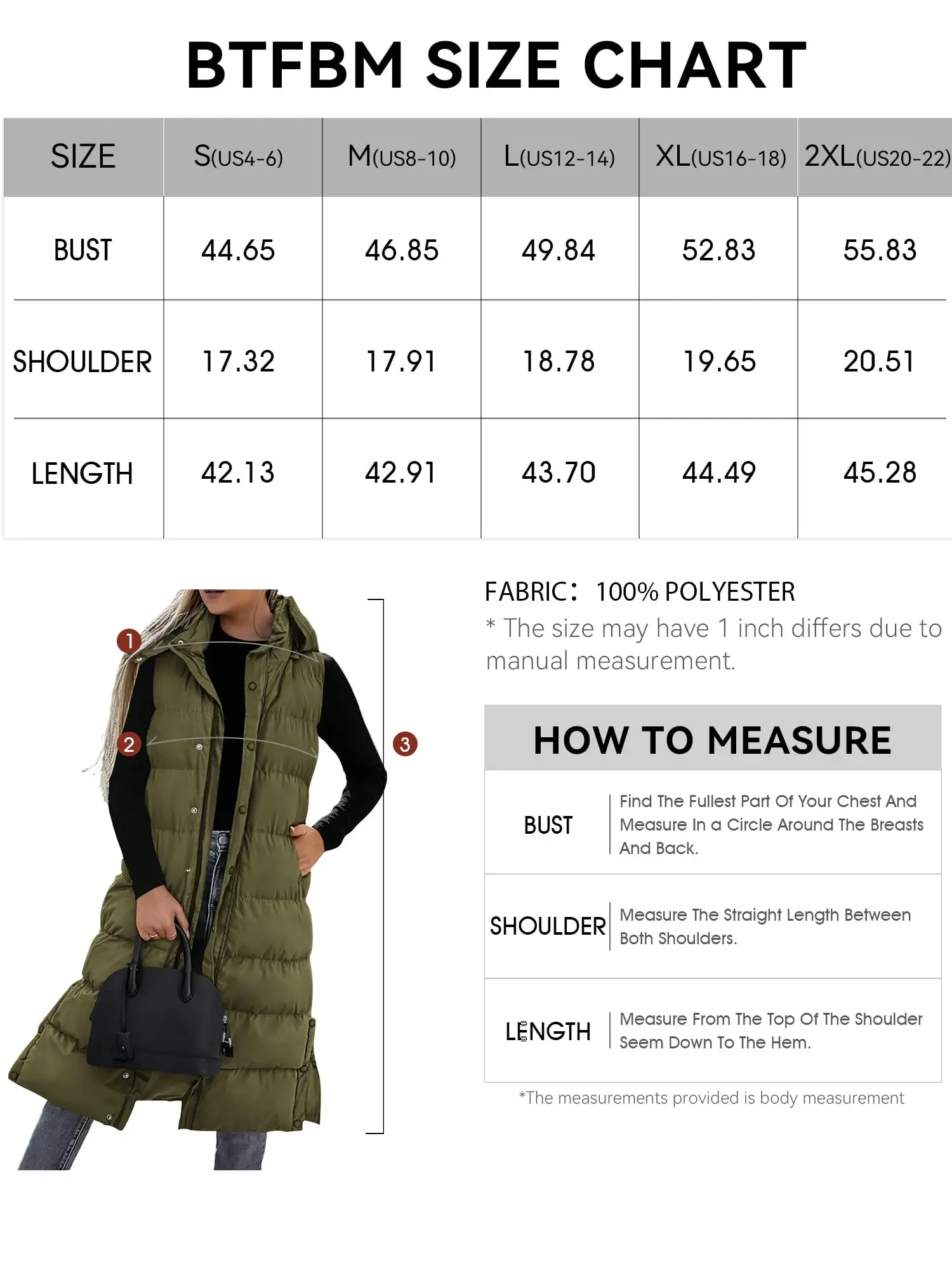 Love love love this piece, I can’t say enough good about it. I’m 208 lbs 5’9 smaller on top bigger through the mid and a large fit me perfect! I definitely recommend to my in between and plus size Mamas that want to be stylish. Quality material and has the zip and button front. All around good vest. Oh and plenty long enough.