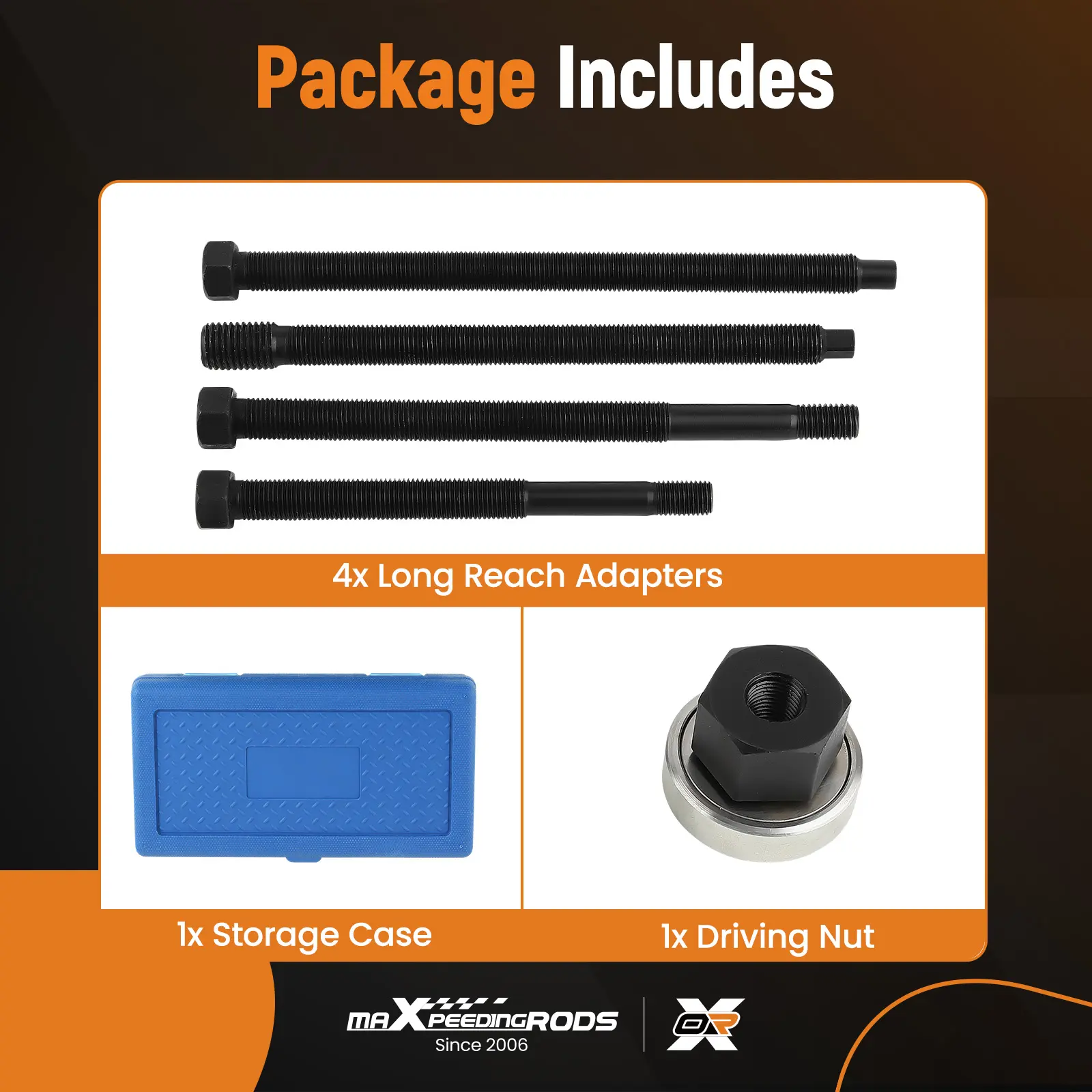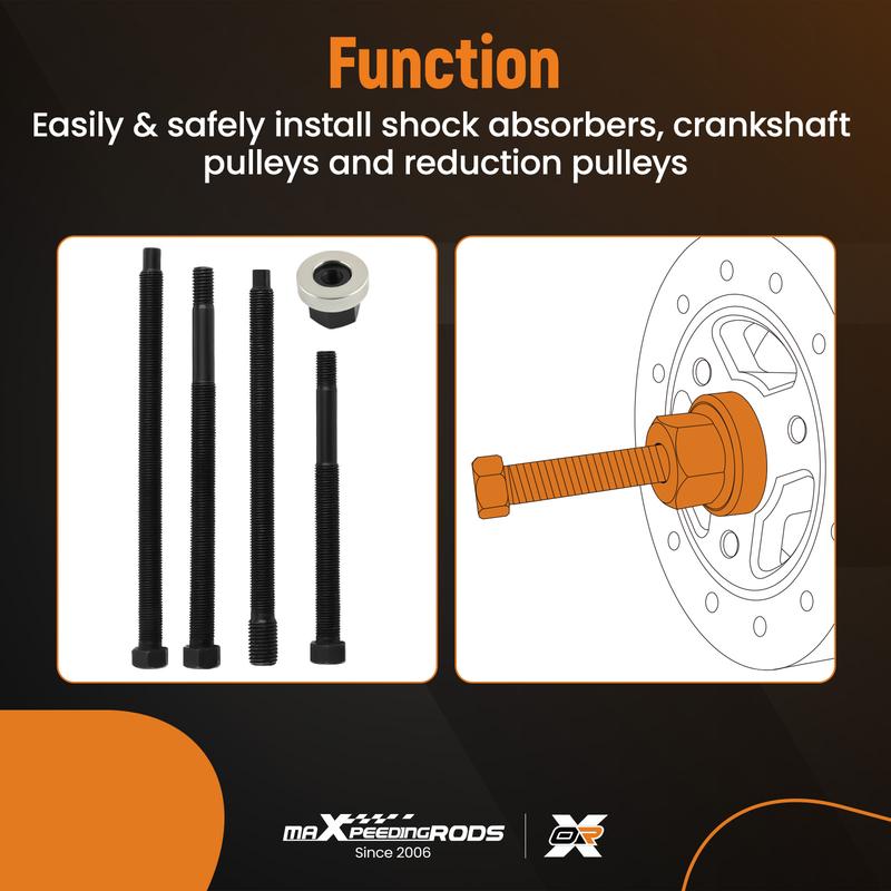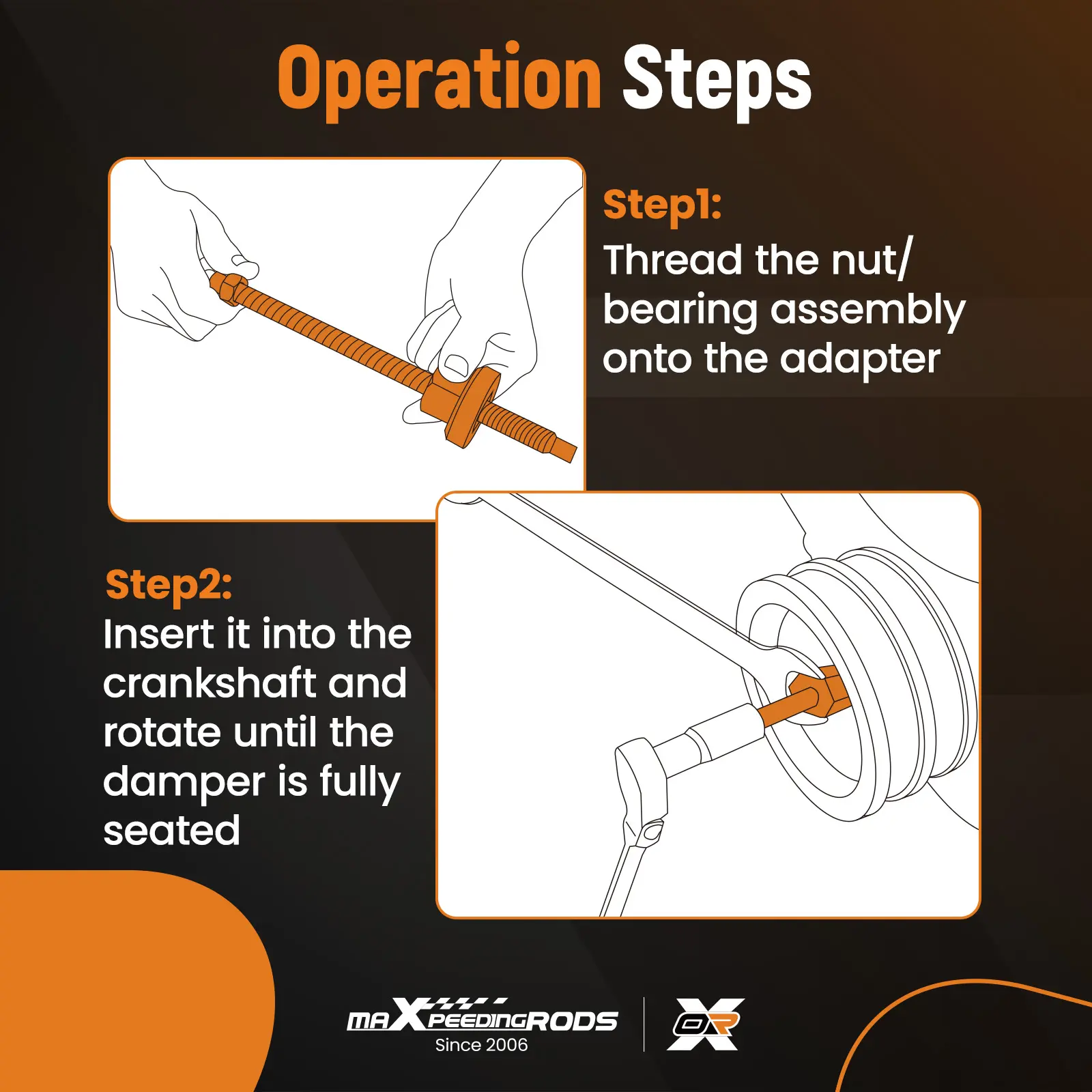 1.Damper Installation Made Easy: Make damper installation a breeze with our harmonic damper installer kit; simply thread the nut/bearing assembly onto the adapter, insert it into the crankshaft, and rotate until the damper is fully seated