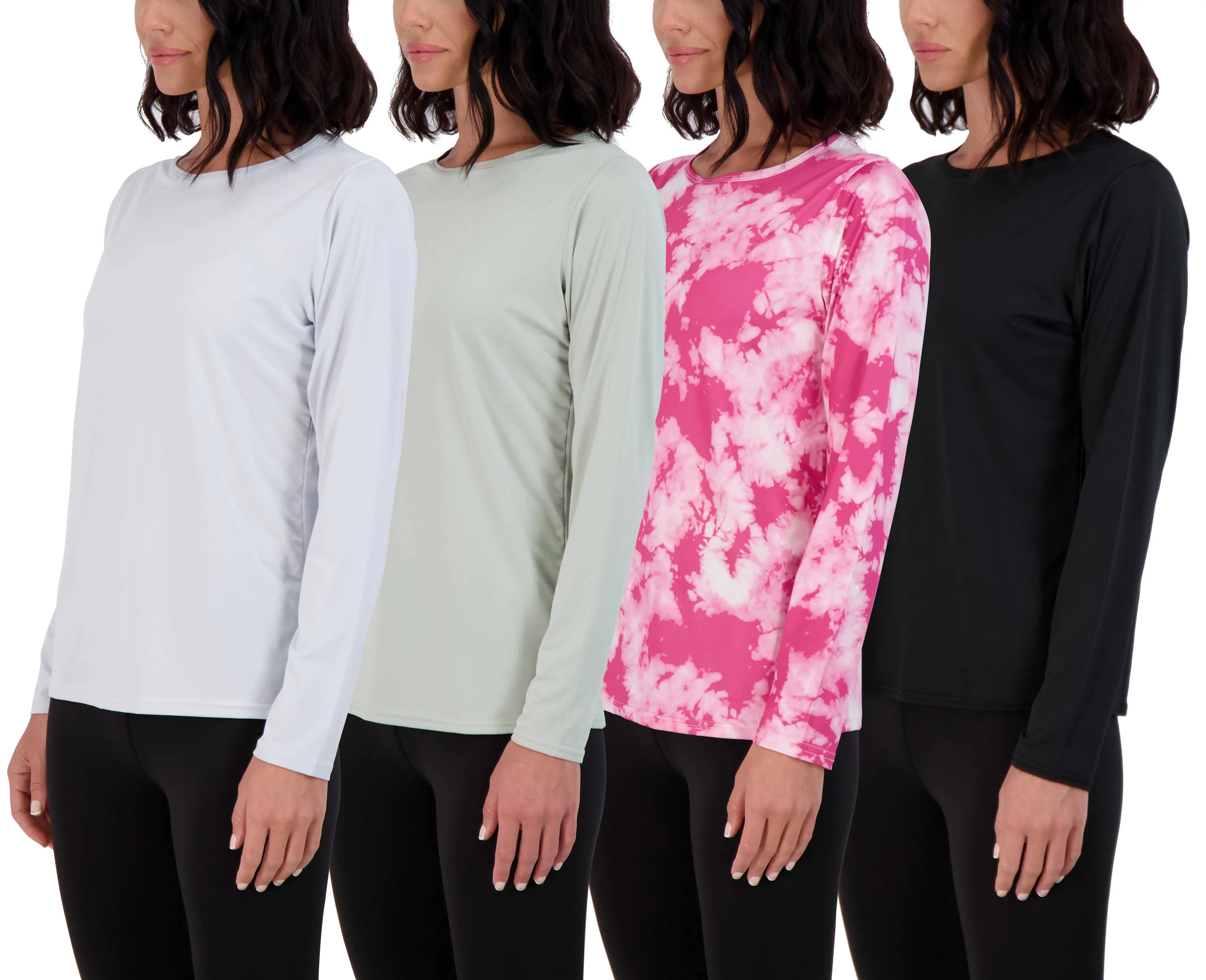 Real Essentials 4 Pack: Women's Dry-Fit Tech Stretch Long-Sleeve Athletic Workout T-Shirt (Available in Plus Size)