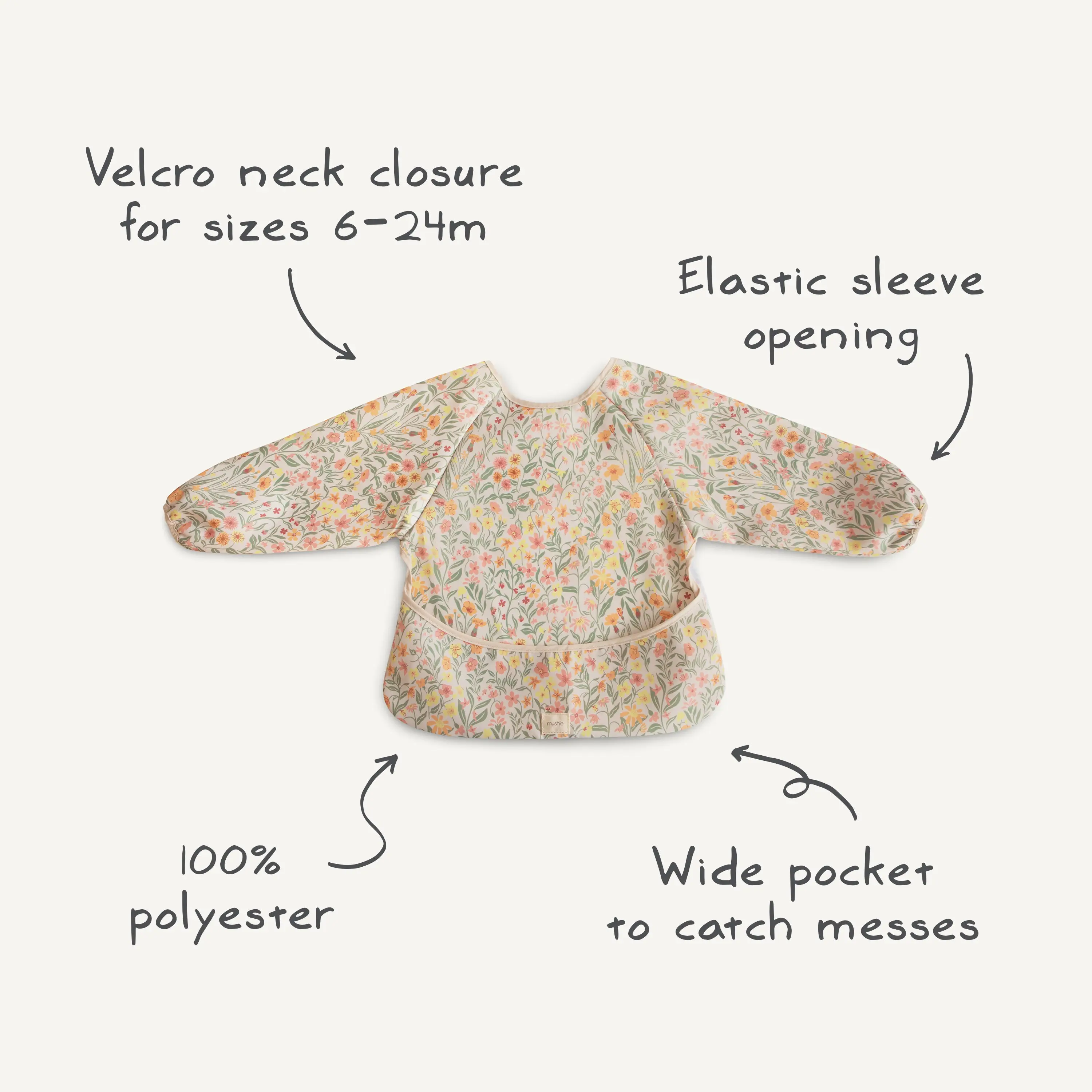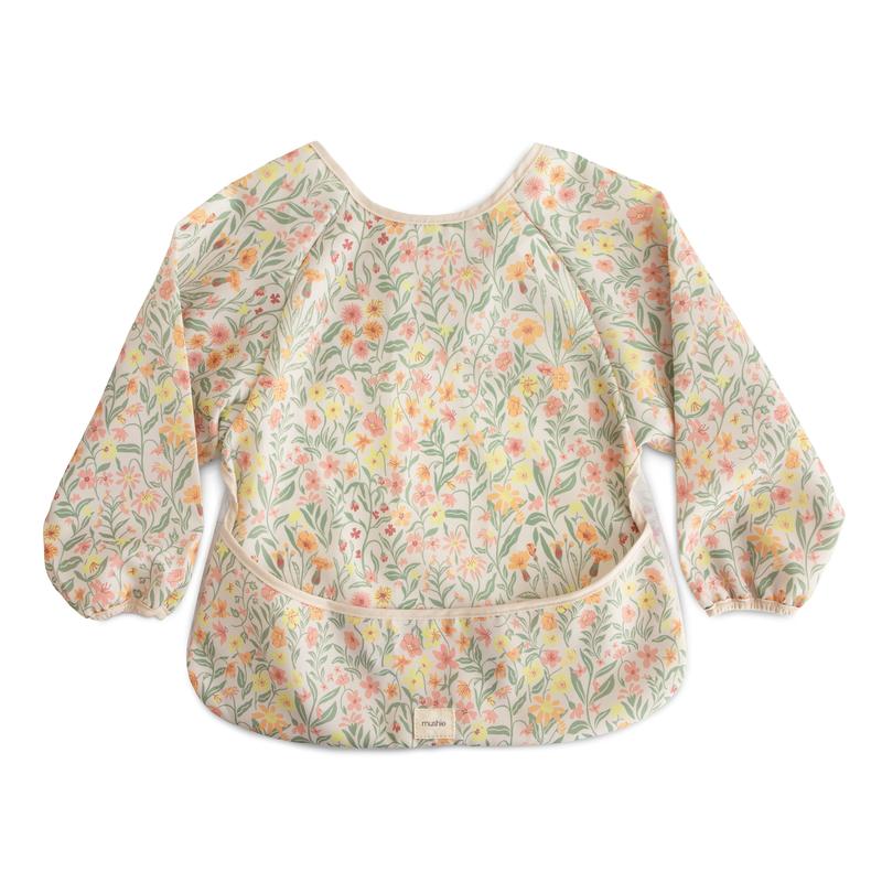 These bibs are super cute even if a little too big for my 6 months old. But we roll the sleeves and it protects her clothes perfectly. We put it on top of her high chair straps to protect those as well and it works very well. We have two to rotate, the design are super cute and the fabric is easy to rinse in the sink between washes.