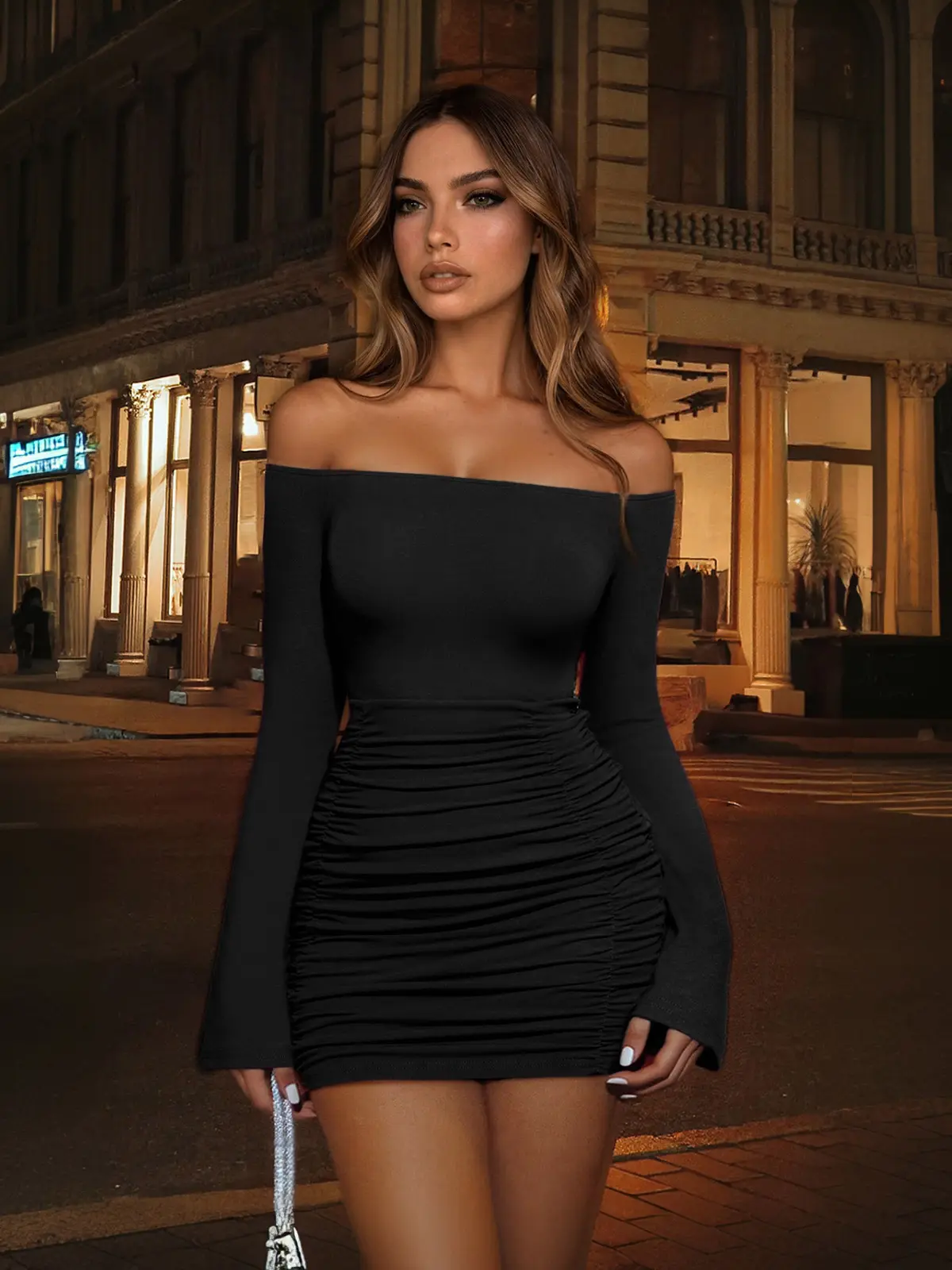 Head-Turning Style: This isn't just a dress—it's a statement. The off-the-shoulder neckline elegantly frames your collarbone and shoulders, adding a touch of romance. The body-hugging silhouette and sexy ruched detailing work together to accentuate your figure, creating a flawless, eye-catching look that's both chic and sophisticated.