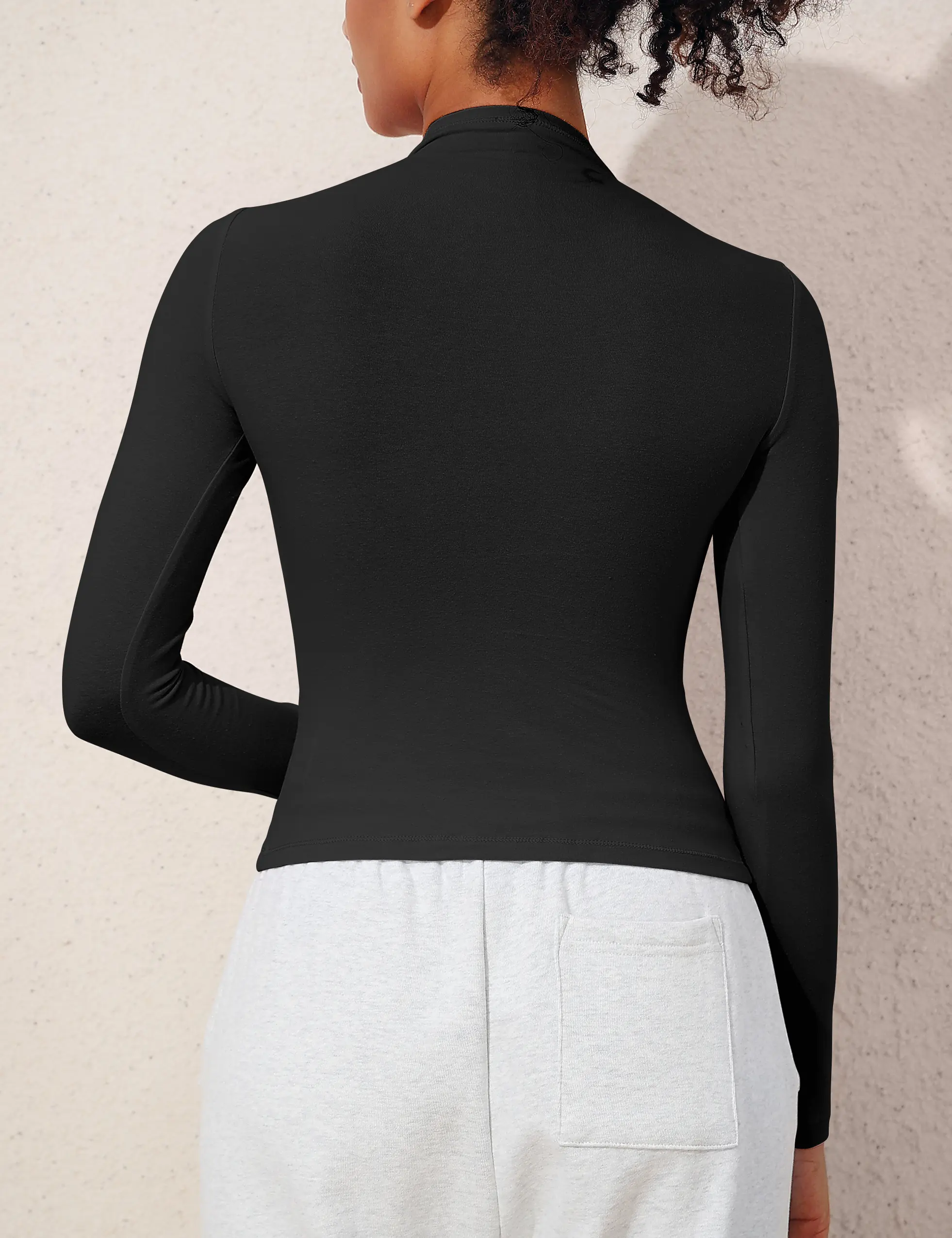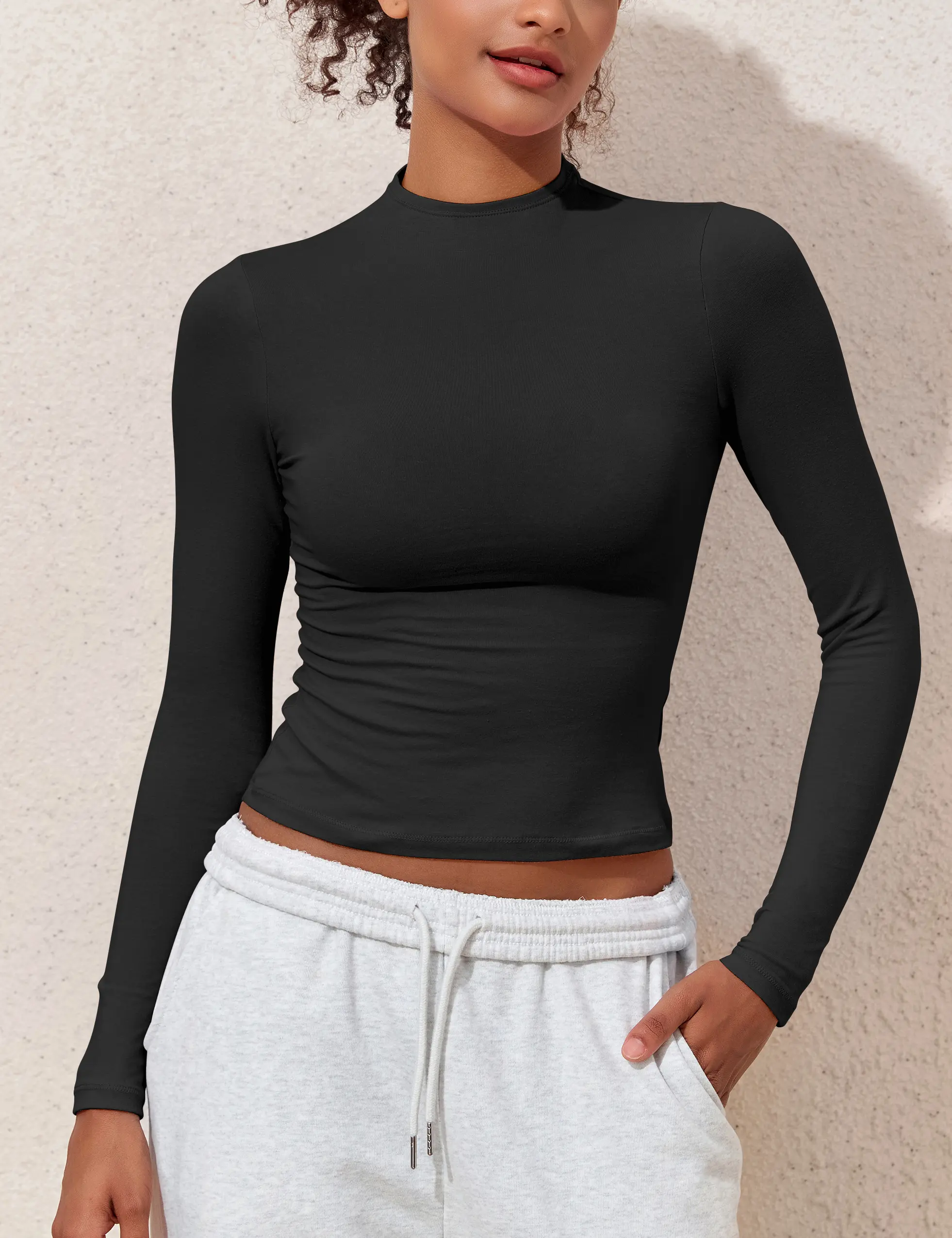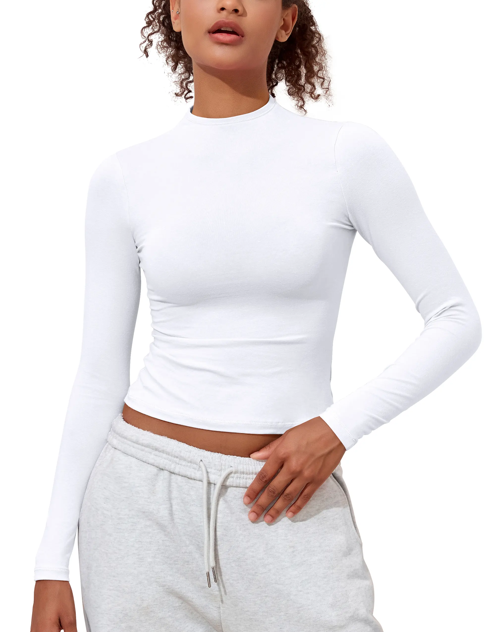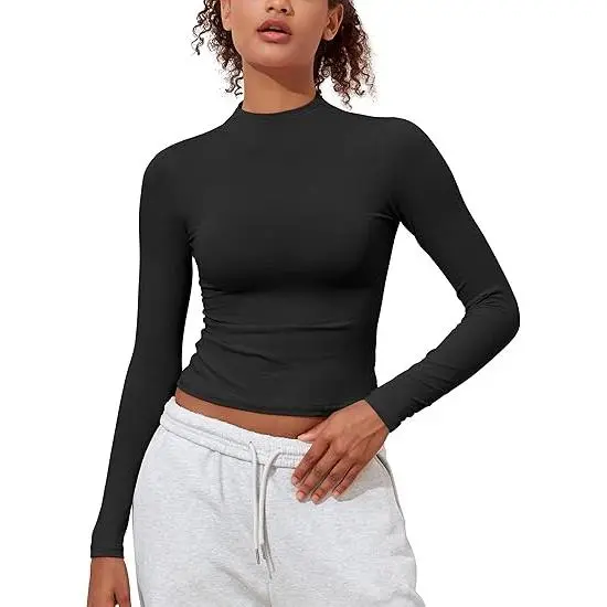 Design: Basic Tees featuring a tight fitted cropped design with long sleeves, t-shirt hugs your waist for a flattering silhouette. The mock neck adds a touch of elegance to its cute and casual style