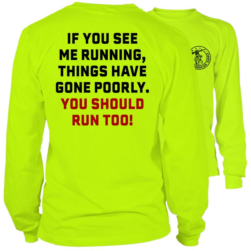 If You See Me Running You Should Run Too - Long Sleeve High Visibility Work T-Shirt - Cotton Poly Premium Blend - Funny, Sarcastic Graphic Tees