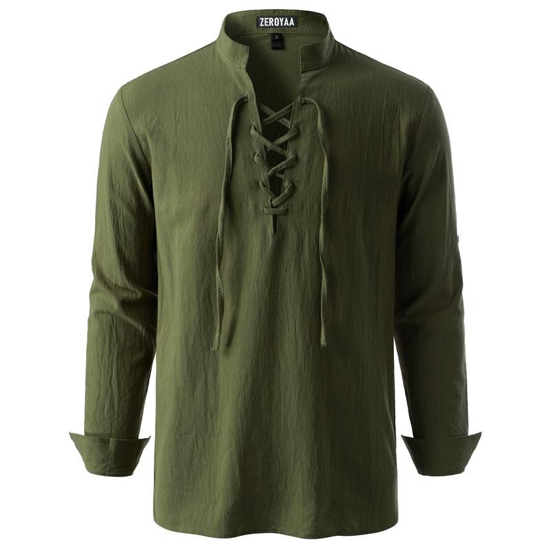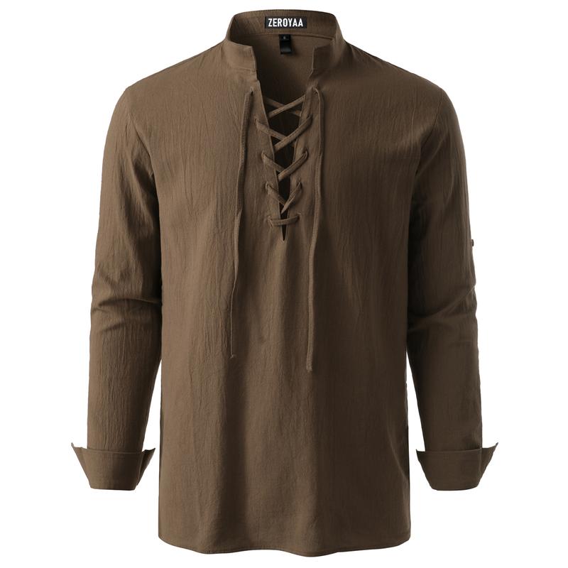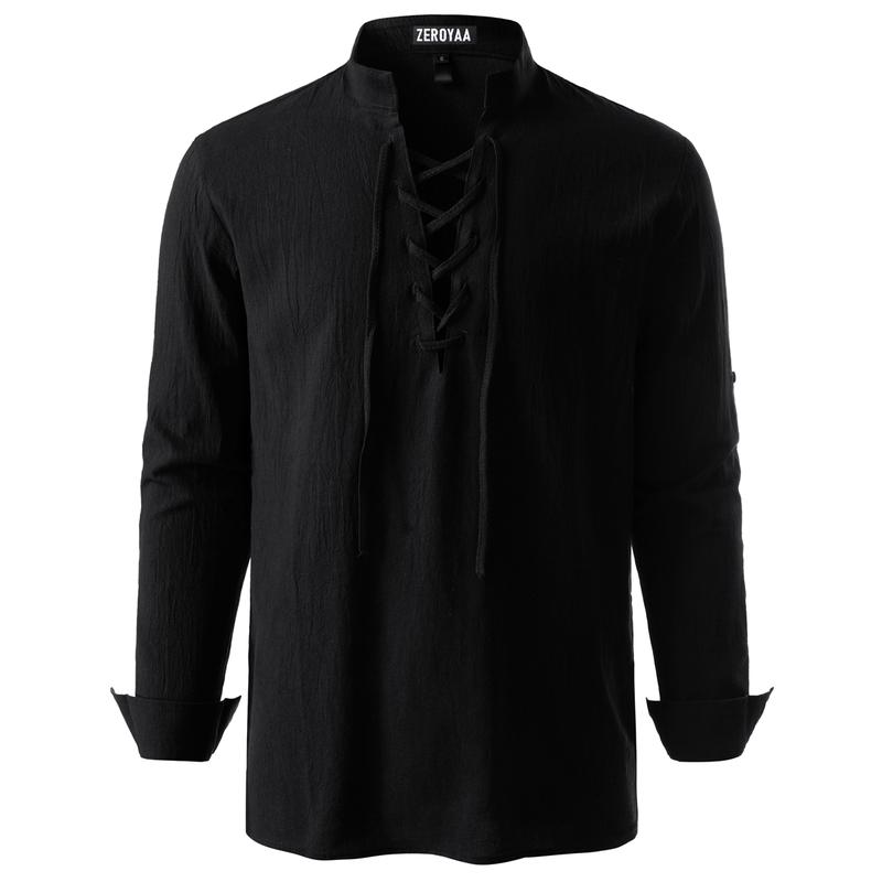 ·New Vintage Design Shirt: Best Choice for Halloween Renaissance Cosplay /Lace Up V-Neck,Banded Collar,Roll-up Sleeves,Long Sleeve Cotton Shirt