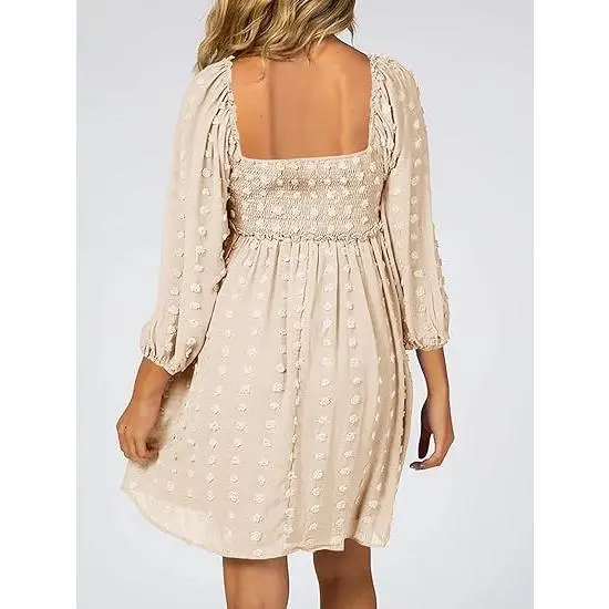 Features: Long sleeve, swiss dot design, tie back, high waist, solid color, flowy swing, casual loose mini dress.