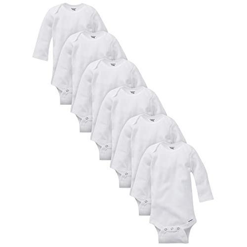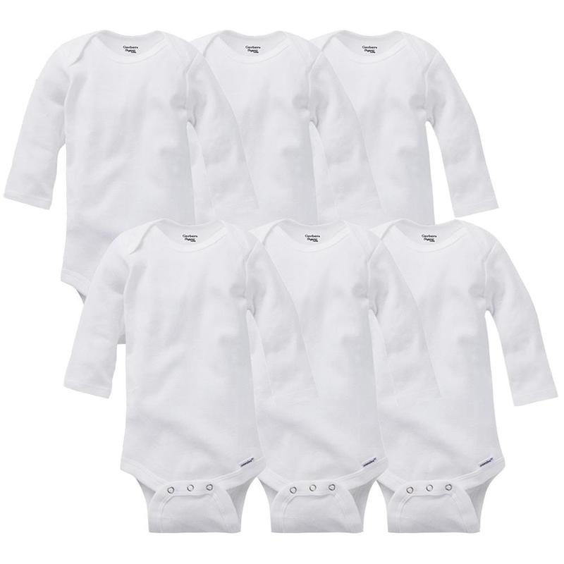 Our Gerber® Onesies® bodysuits are a staple in every baby’s wardrobe! Our white Onesies® bodysuits are perfect for baby boys and baby girls. We had our essentials independently certified with STANDARD 100 by OEKO-TEX® so that you don’t have to worry about harmful substances in your baby’s wardrobe. These baby and toddler bodysuits are machine washable and machine dryable for your convenience. Give them as a thoughtful and practical gift! This pack includes six long sleeve bodysuits.