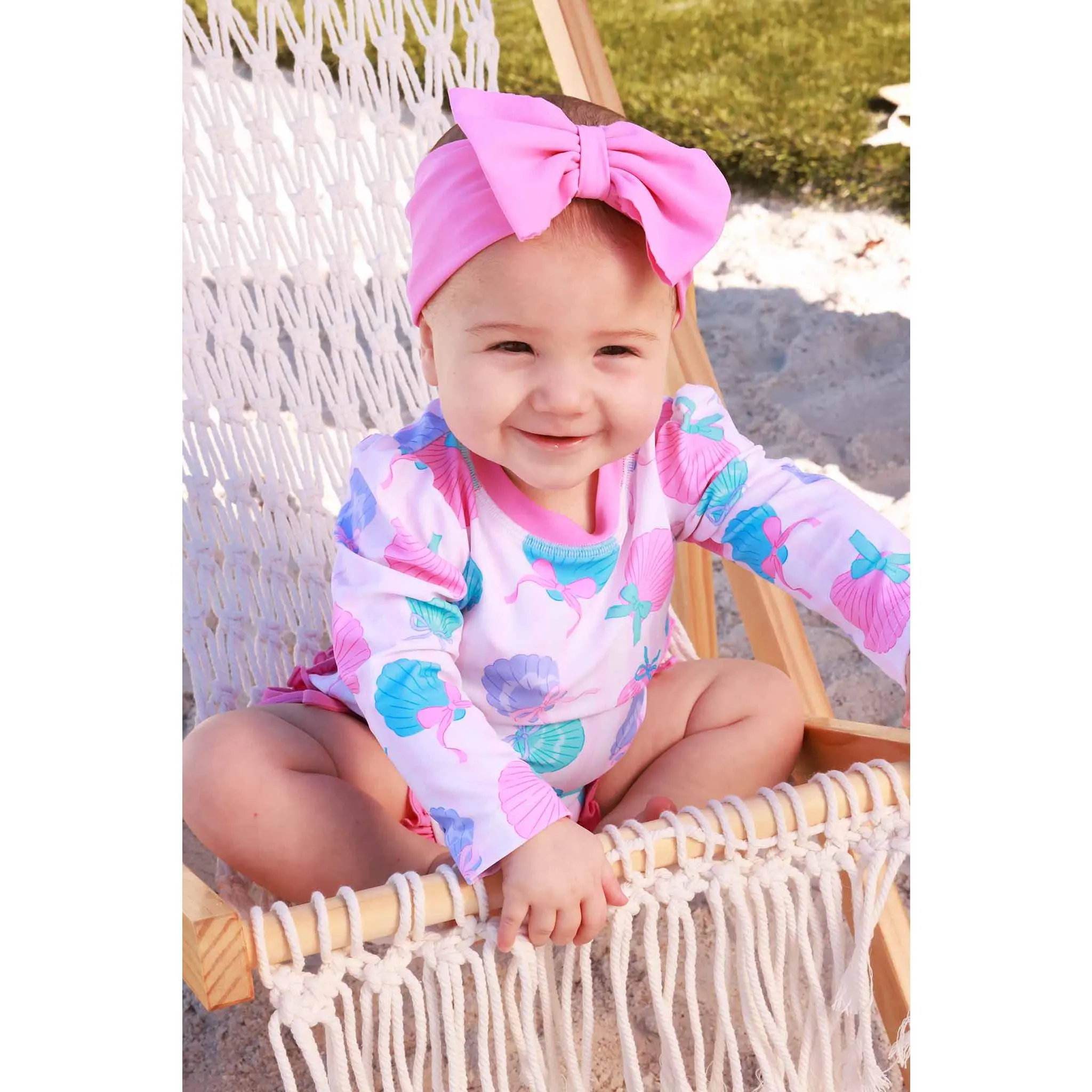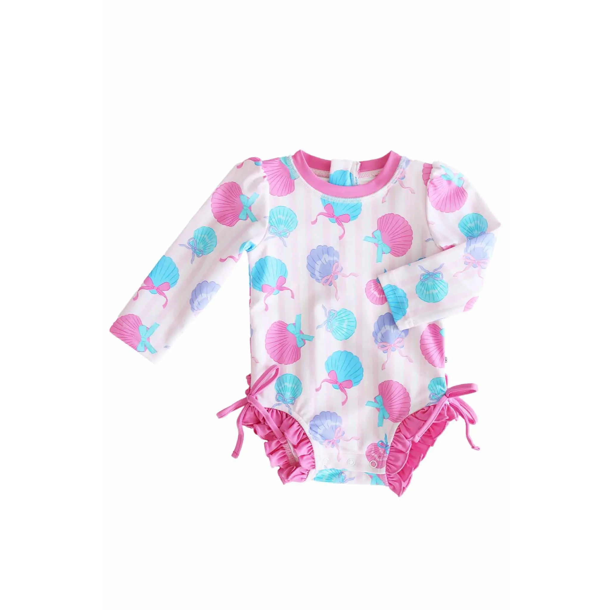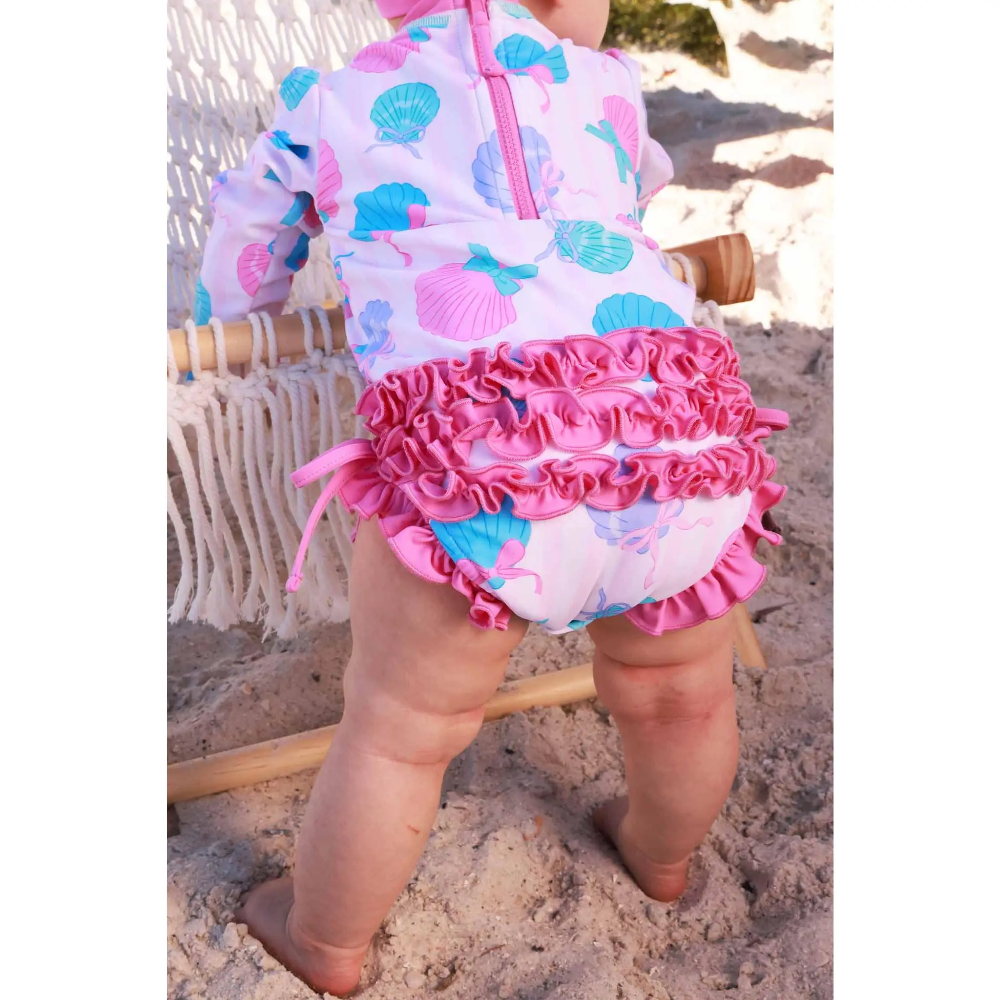 Bring on the sunshine with our Long Sleeve Rash Guard with Ruffle Bottom in Seaside Sweetie! Featuring playful seashells tied up with sweet bows in cheerful pinks and blues, this adorable print is made for beach days, pool parties, and all the summer fun in between. Designed with long sleeves and UPF 50+ fabric, this rash guard helps protect her skin from the sun while she splashes in style.